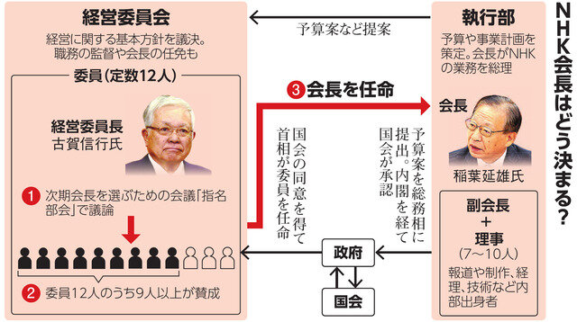■経営委員会が議論して任命。9人以上の賛成が必要 Q NHK会長はどうやって決めているの? A 経営者や大学教授など12人の委員からなるNHK経営委員会が、NHK会長を決める...