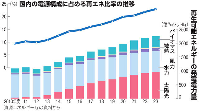 ■全体の2割超まで増加。特に太陽光が伸びている Q 再生可能エネルギーの現状は。 A 資源エネルギー庁によると、2023年度の再エネの発電量は、10年度の約2倍にあたる226...