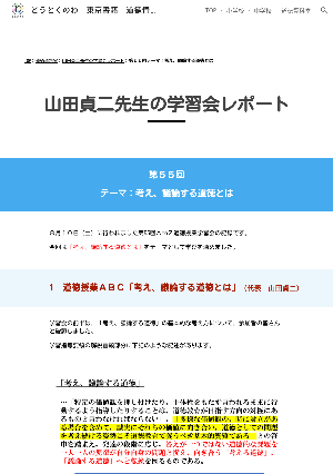 東京書籍の道徳情報サイト「どうとくのわ」の記事です。「山田貞二先生の学習会レポート」では、道徳科の授業を中心にして学び合う学習会「AtoZ道徳授業学習会」の様子をお伝えしています。今回のテーマは「考え、議論する道徳とは」です。