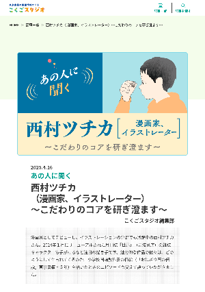 東京書籍の国語情報サイト「こくごスタジオ」の記事です。今回は、漫画家、イラストレーターとして活躍中の西村ツチカさんにインタビューを行いました。魅力的な作品の数々は、どのようにして生まれてくるのか。小学校国語教科書の挿絵(「おにぎり石の伝説」東京書籍・5年)を描いたときのエピソードも交えて語っていただきました。