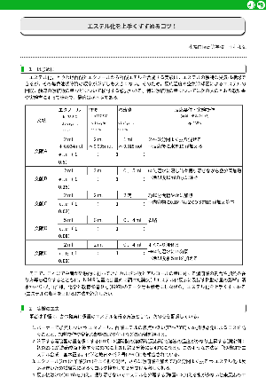 【本文より】エステル化,とりわけ酢酸とエタノ-ルから酢酸エチルを合成する実験は,エステルの独特な臭気は確認できるが,その無色油状物質の収率が必ずしも大きくない。そのため,反応温度や空気冷却管によるエステルの回収,触媒の濃硫酸の量などについて検討する必要がある。特に濃硫酸の量については次の表のとおり教科書や実験書によって様々で,最適量が不明である。