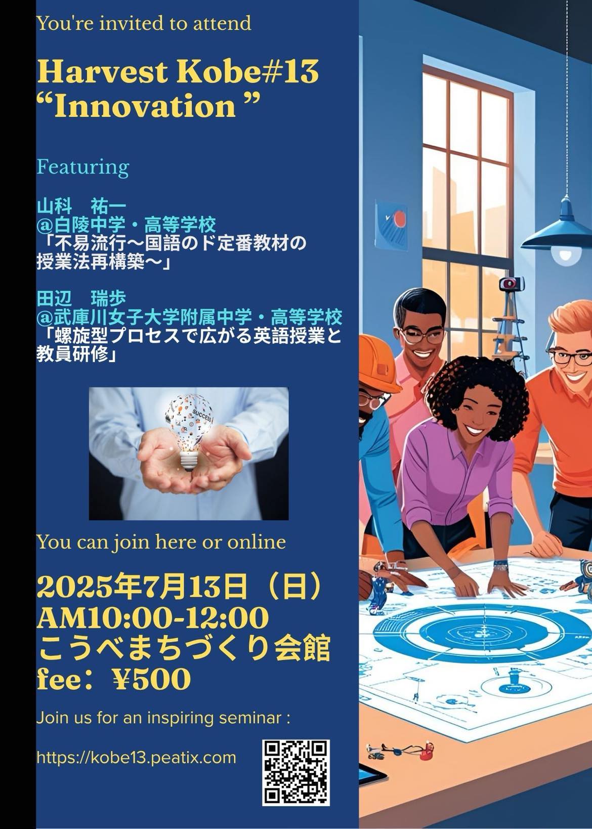 神戸支部第13回Harvestのお知らせです。今回のテーマは“Innovation”です。今回も2名の先生方による発表、参加者同士による意見交流を予定しています。どちらも新しい取り組みに挑戦されている先生方であり、授業改善のヒントになること間違いなしの内容となっております。校種・教科・地域・職種を問わず、どなたでもお気軽にご参加いただけると幸いです。皆様にお会いできるのを楽しみにしております!