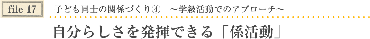 その子の内側にあるよさが発揮できる場と位置付けているのが,係活動です。学級をよりよくするという目標を全員で共有した上で,それぞれが活動を創造していきます。活動を始めたころは,自分の興味関心を優先することもありますが,次第にどうやったら友だちを楽しませられるかという視点で活動を見直すようになります。個性を生かしながら友だちとの関わりを生む取組です。