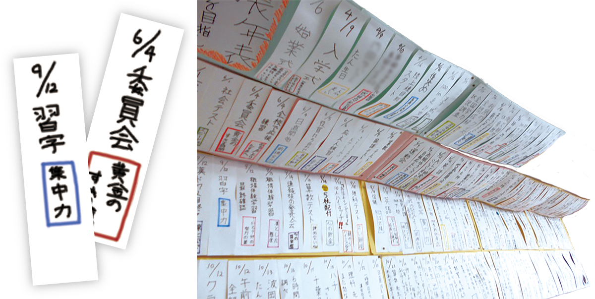 教室の壁に,行事や日々のイベントを貼り出し,短期的な目標を示しています。この掲示が積み重なると,自分たちの行事を通した成長の足跡=「成長年表」になるのです。