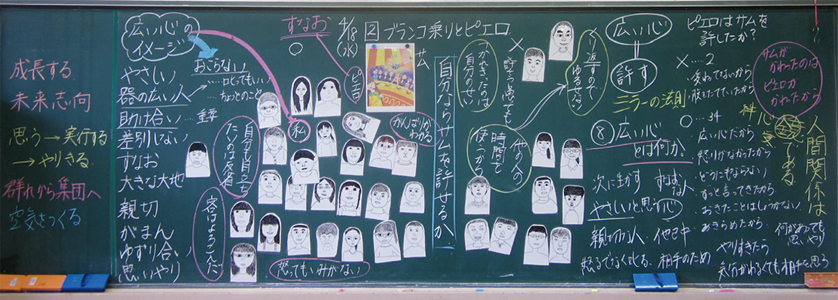 授業は,学級全員が主体的に考え,全員で学び合う時間だと思います。そのためには,全員参加が保障されることが大切です。全員参加を視覚的に示す方法として,私の学級では「自画像」を活用しています。自画像は,4月に子どもたち自身に描かせ,黒板上部に常に貼っておきます。そして,意思決定の場面や,立場を明確にする場合に使います。