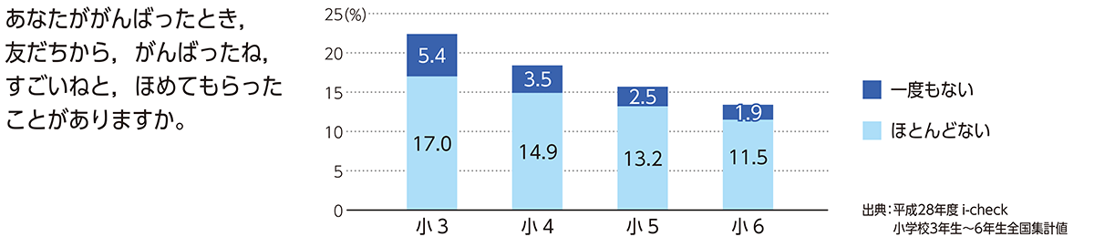 友だちからほめられる経験についての質問の回答率を見てみると,小3から小6にかけて否定的な割合が減少していることが分かります。学年を追うごとに,友だちとほめ合い認め合う関係が育っていく様子がうかがえます。しかし,小3の時点では,まだ20%強の割合の子どもが,友だちからほめられた経験が「ほとんどない」「一度もない」と否定的に回答している点が気になります。
