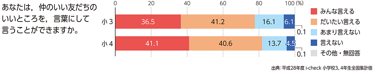 友だちのいいところを「言葉にして」言うことができるかという質問では,80%前後の割合の子どもが「みんな言える」「だいたい言える」と肯定的に回答しています。反面,仲のいい友だちであっても,いいところを「言葉にして」伝えられない子どもたちが20%程度いることが分かります。