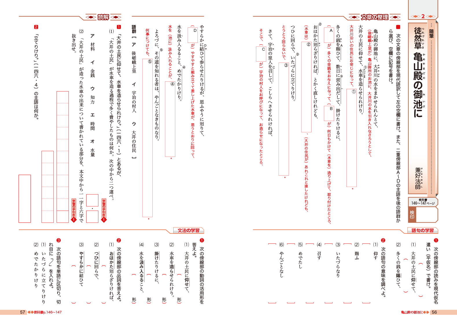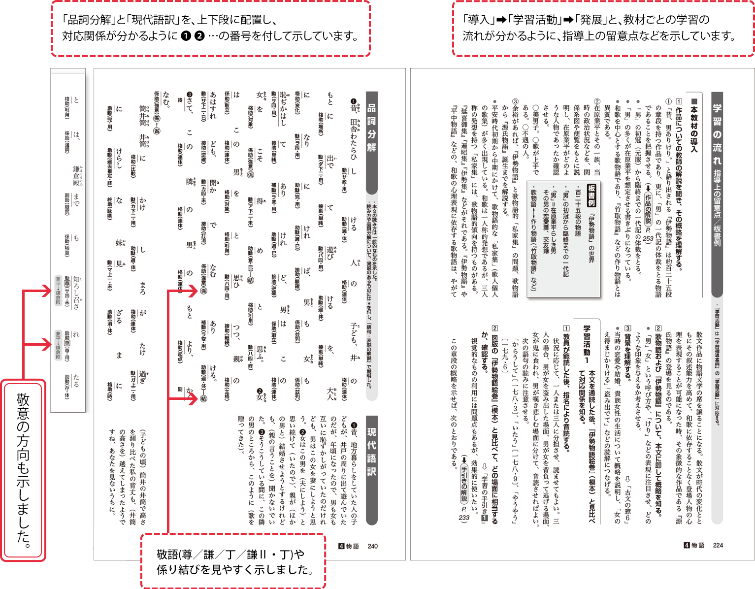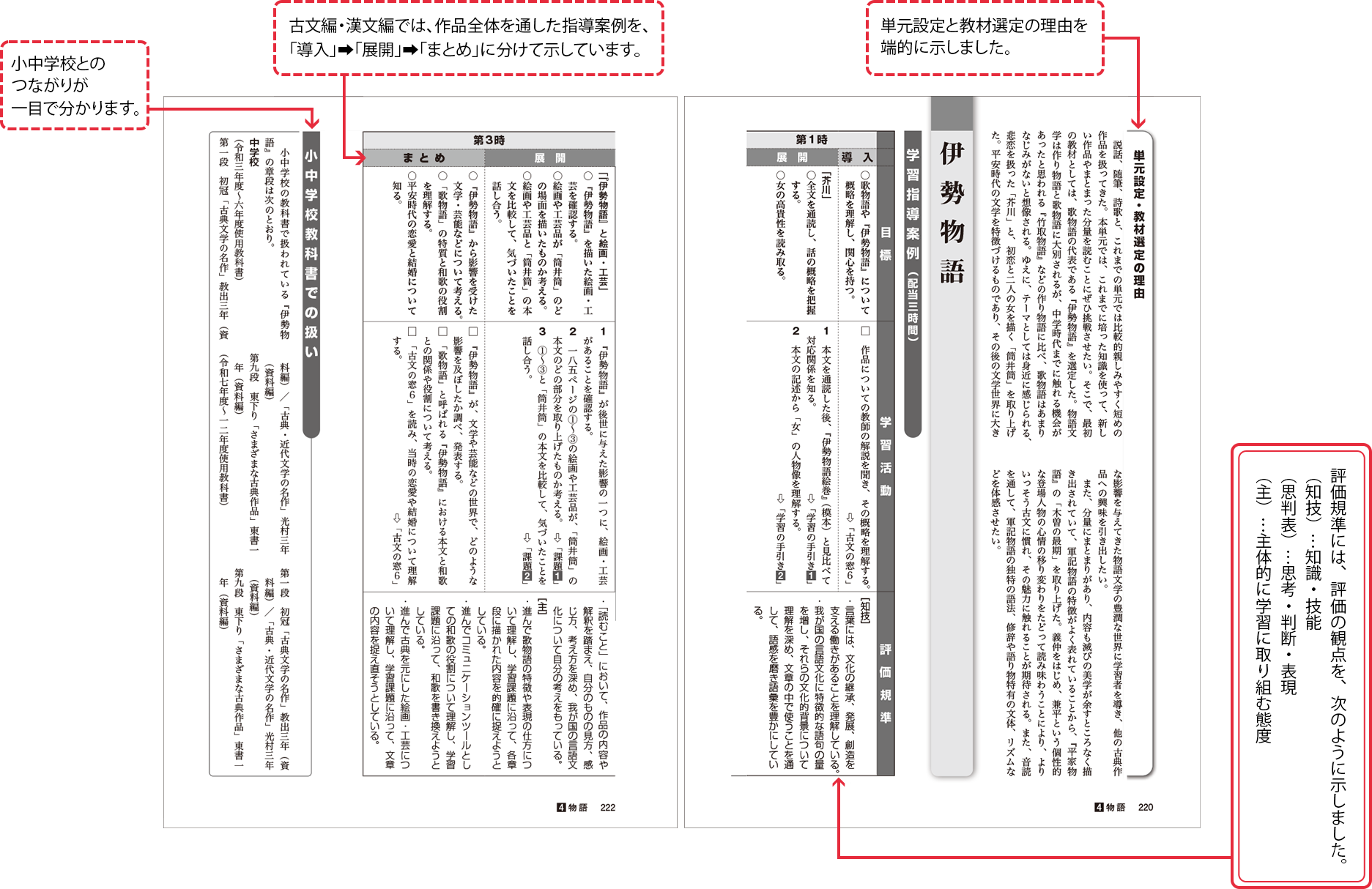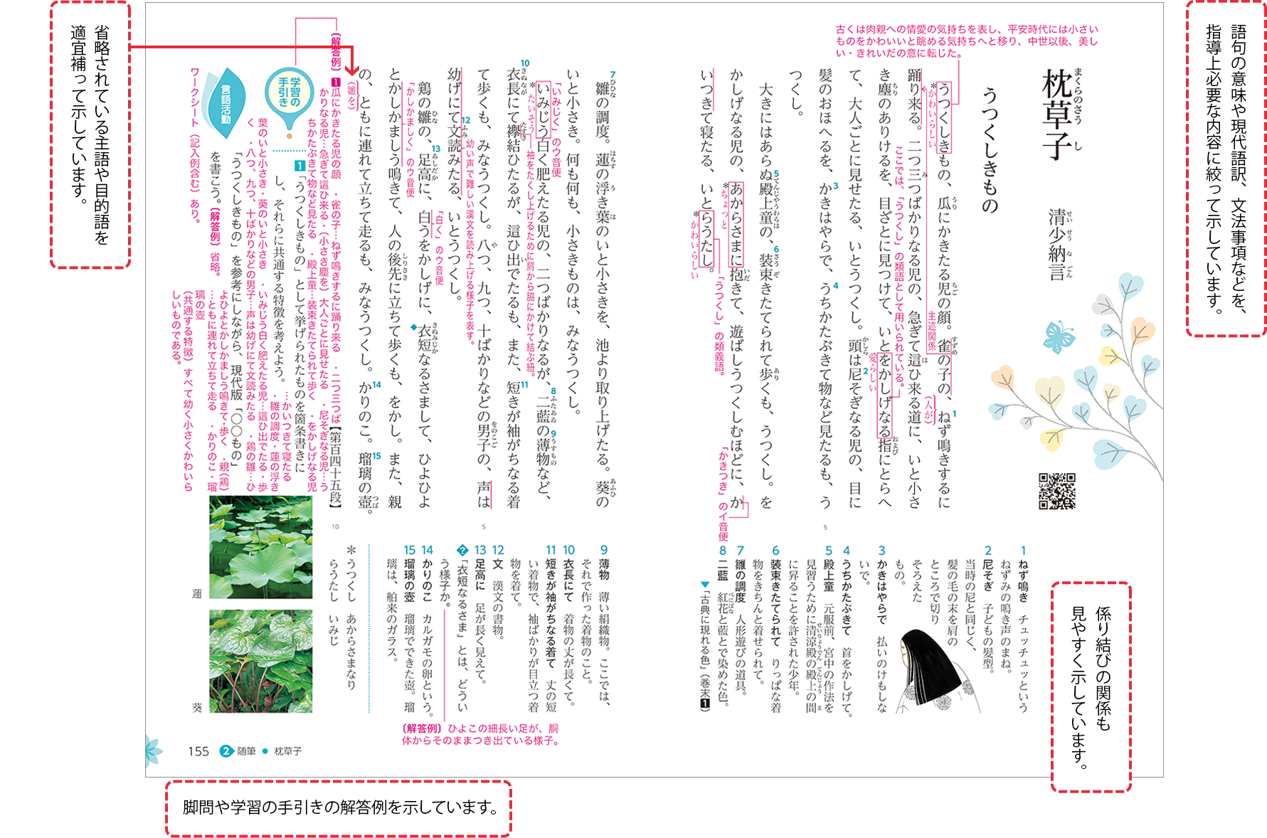 ・現代文では古典的な定評教材や教科書採録教材と同じテーマ・筆者の作品など、古文・漢文では教科書採録作品の別の章段など、授業で発展的に使える資料を収録しています。