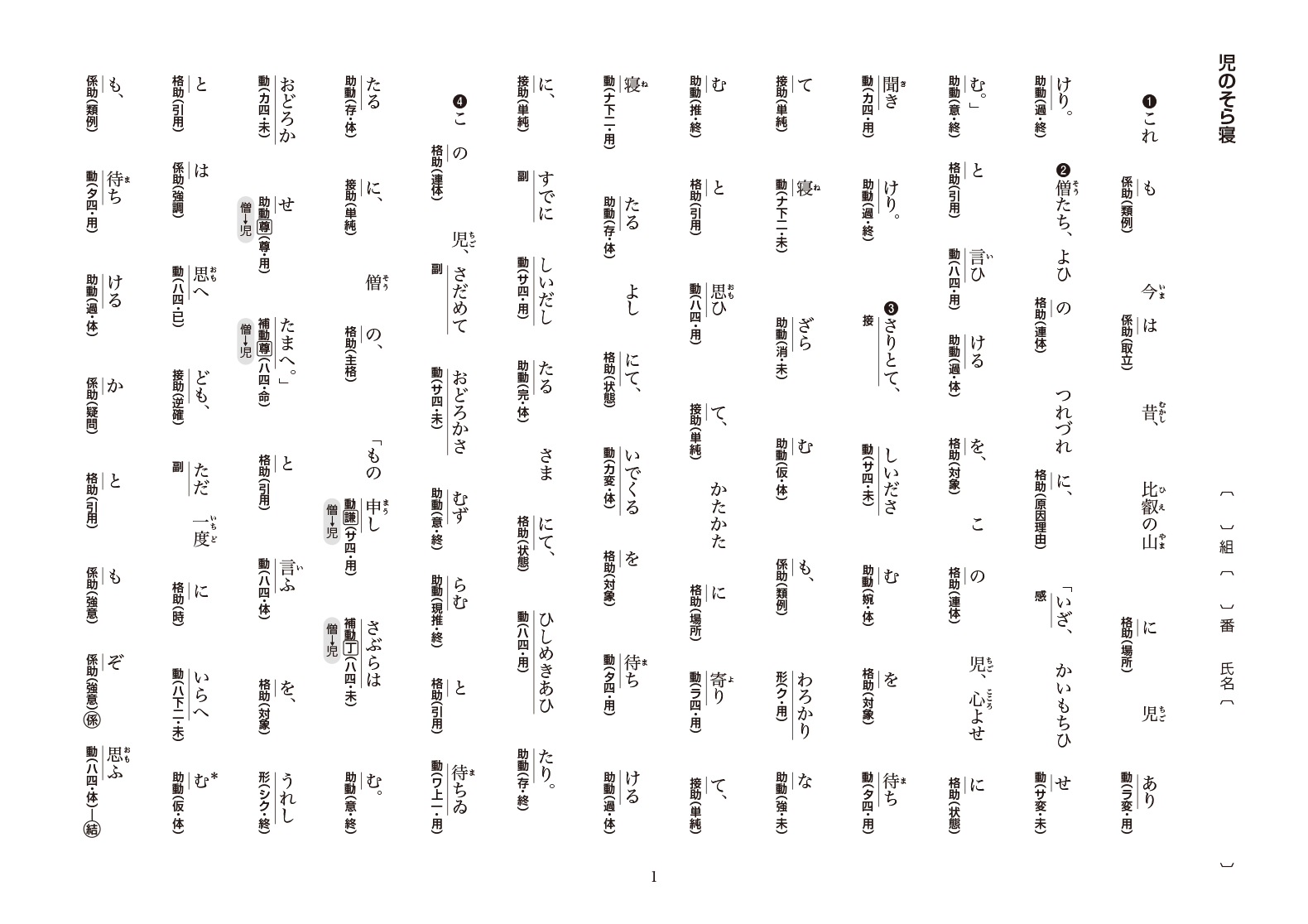 ・古文の教材本文を、品詞分解を書き込めるスタイルに加工したワークシート。