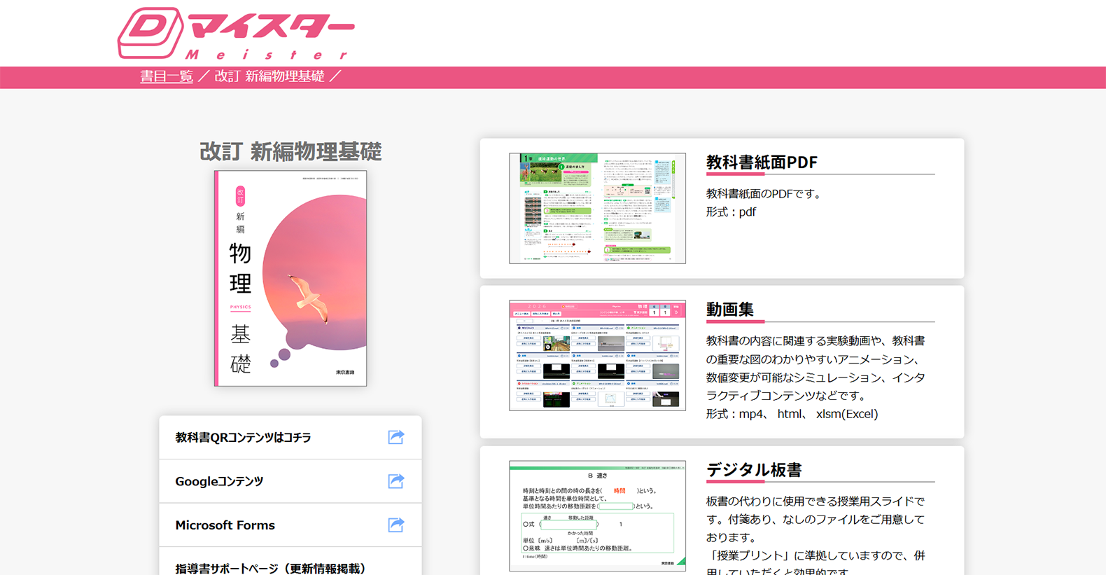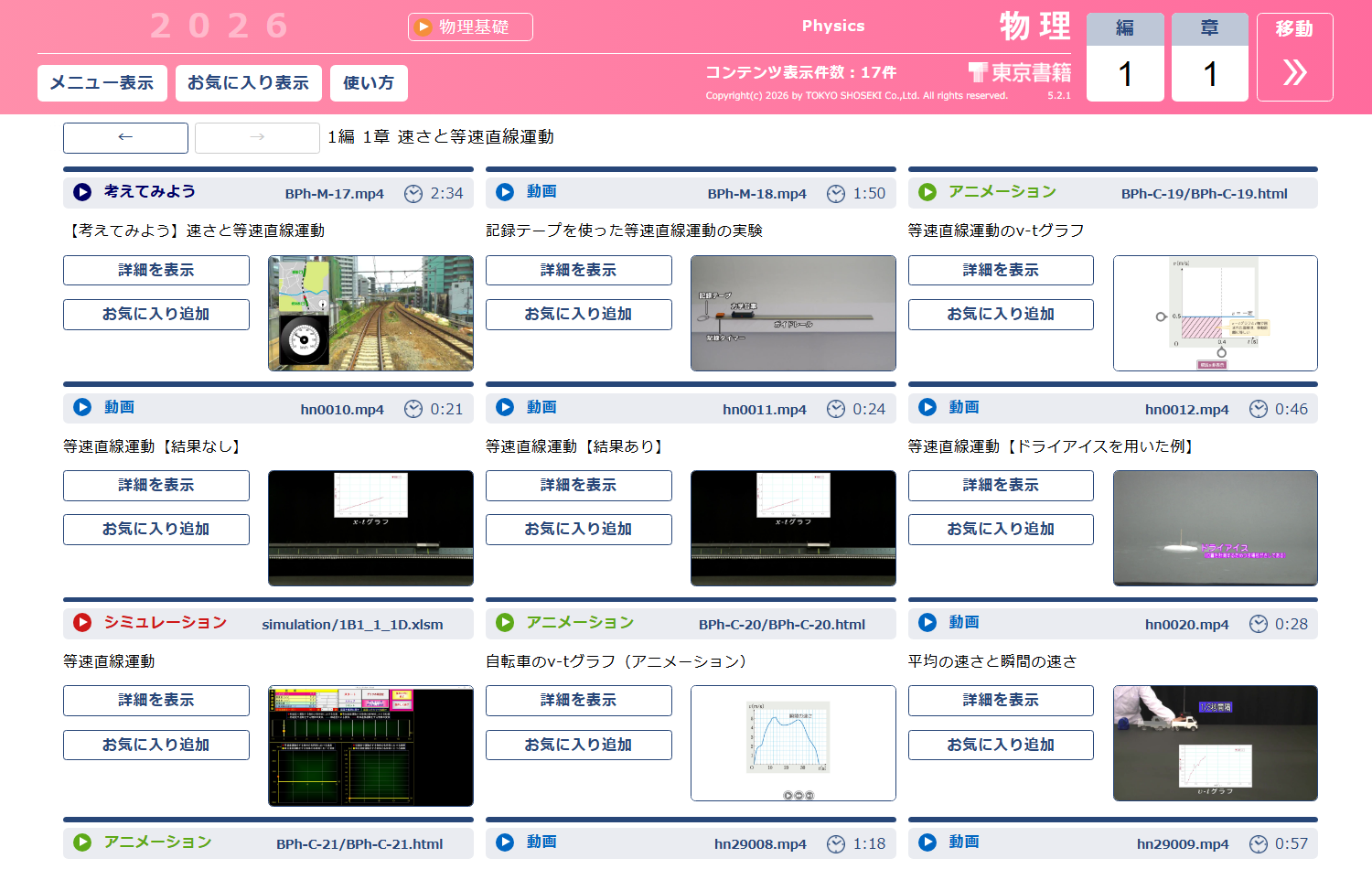 教科書の内容に関する実験動画や、教科書の重要な図のわかりやすいアニメーション、数値変更が可能なシミュレーション、インタラクティブコンテンツなどを収録しています。