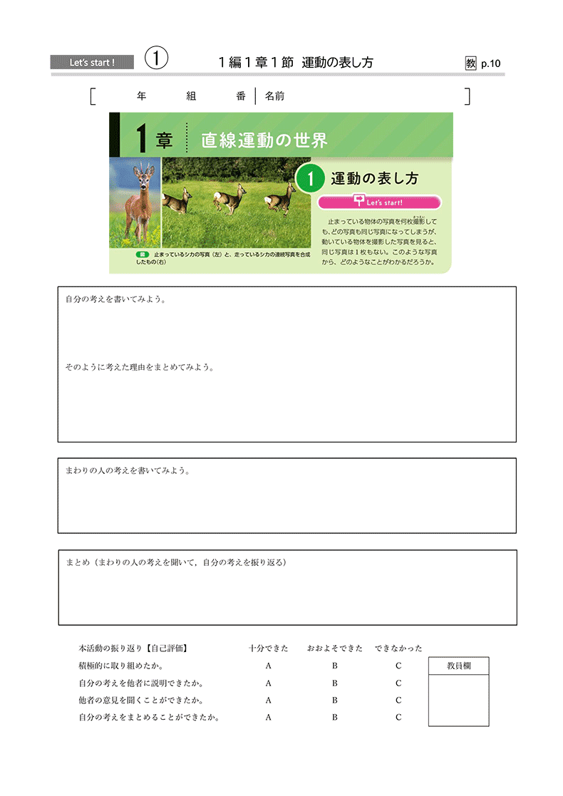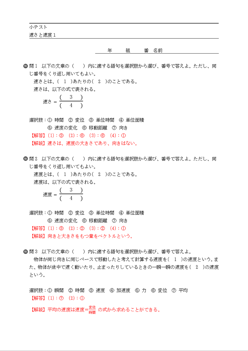 短時間でできる簡単な問題プリントです。直接解答が書ける生徒用と、解説の入った教師用を収録しており、評価の3観点に対応しています。