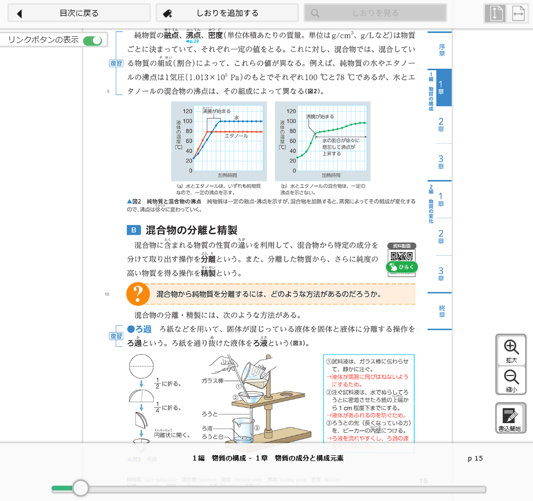 『改訂 化学基礎』では、教科書の裏表紙や目次のほか、教科書の内容に合わせて配置された二次元コードから、QRコンテンツへアクセスいただけます。