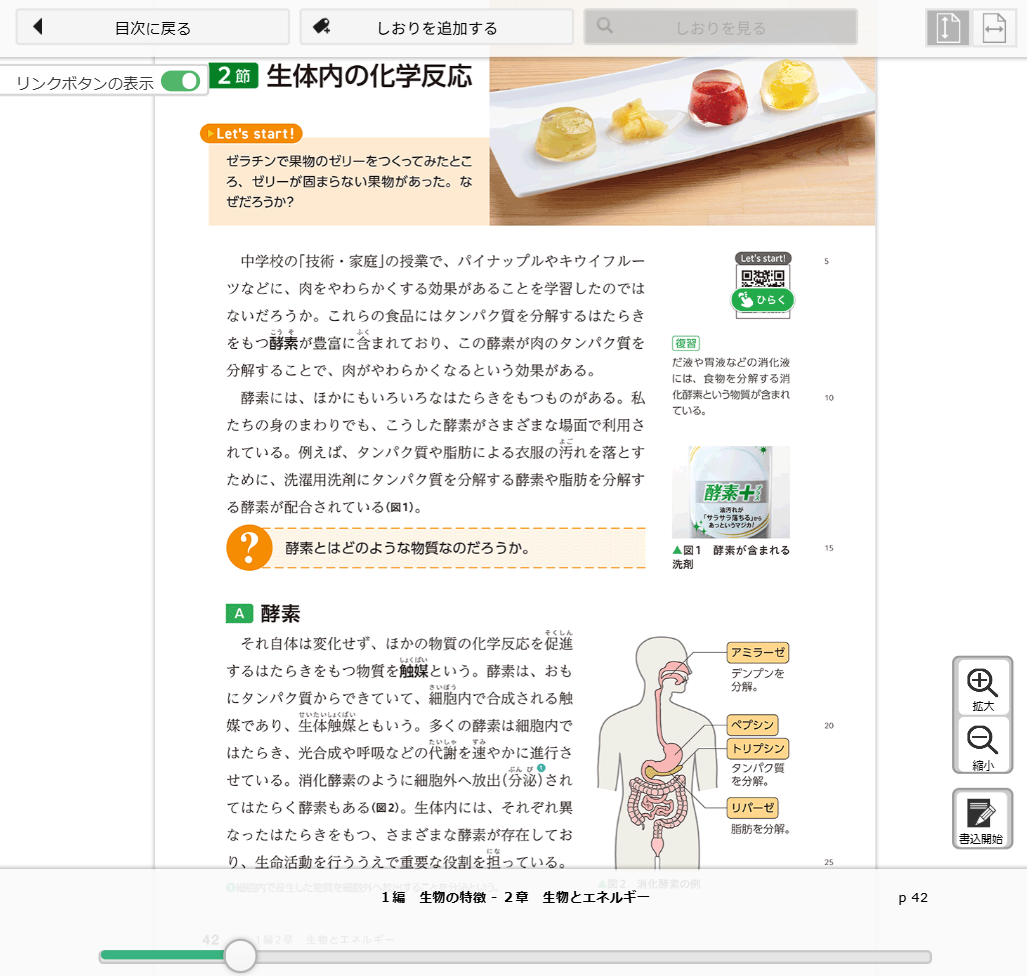 『改訂 生物基礎』では、教科書の裏表紙や目次のほか、教科書の内容に合わせて配置された二次元コードから、QRコンテンツへアクセスいただけます。