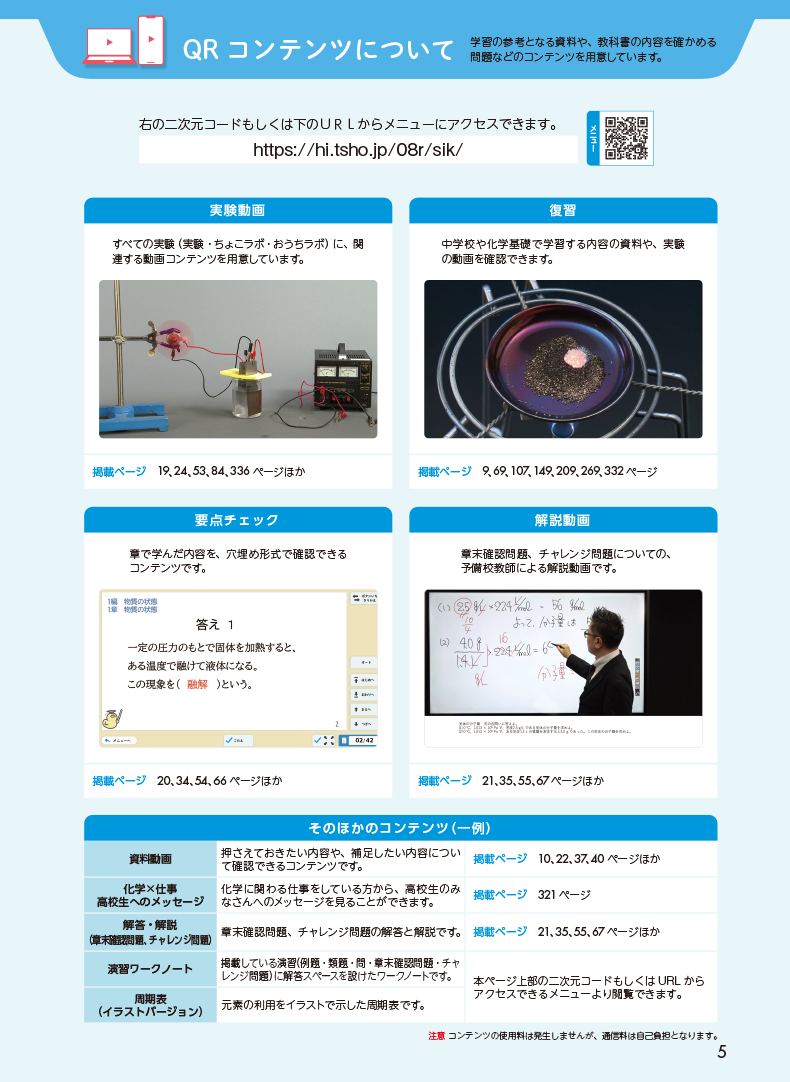 『新編化学』では、教科書の裏表紙や目次のほか、教科書の内容に合わせて配置された二次元コードから、QRコンテンツへアクセスいただけます。