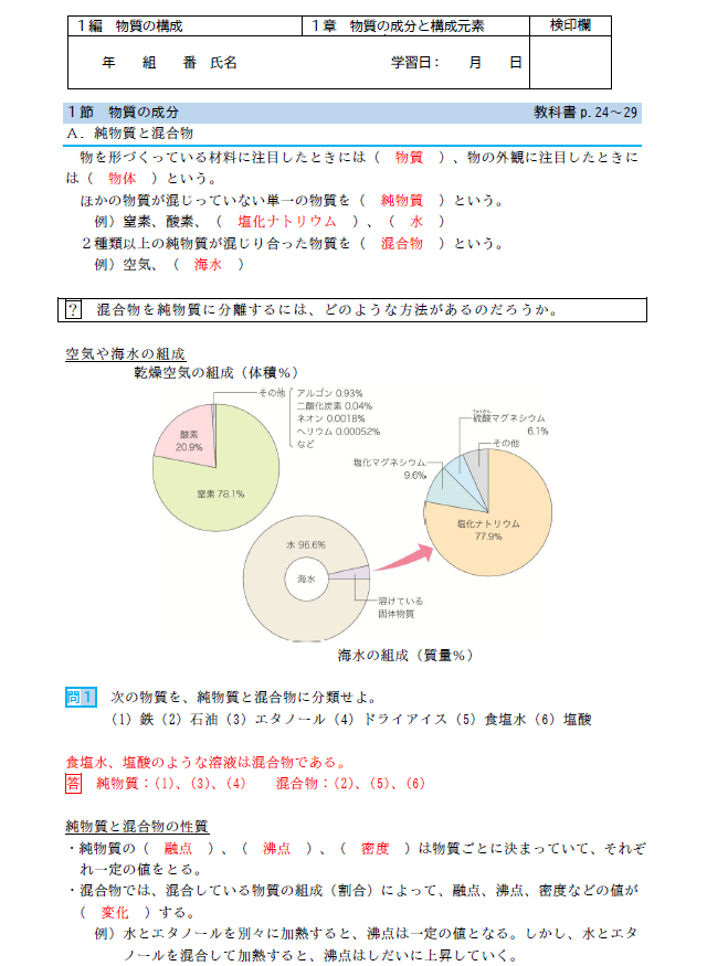 教科書に準拠した授業プリントです。穴埋め形式の生徒用と解答を赤字で記入した教師用を収録しています。