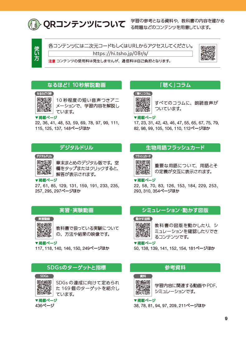 『改訂 生物』では、教科書の裏表紙や目次のほか、教科書の内容に合わせて配置された二次元コードから、QRコンテンツへアクセスいただけます。