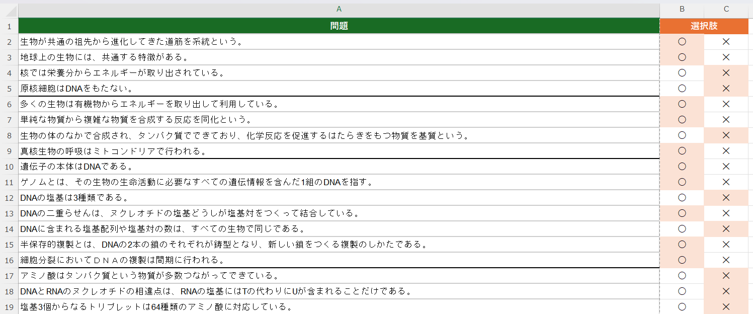 教科書の文章から出題される、〇✕で答える簡単な問題です。