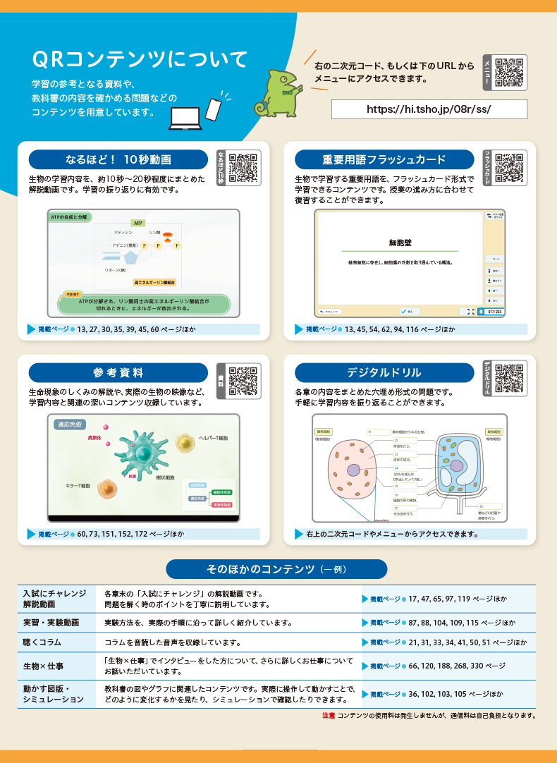 『スタンダード生物』では、教科書の裏表紙や目次のほか、教科書の内容に合わせて配置された二次元コードから、QRコンテンツへアクセスいただけます。