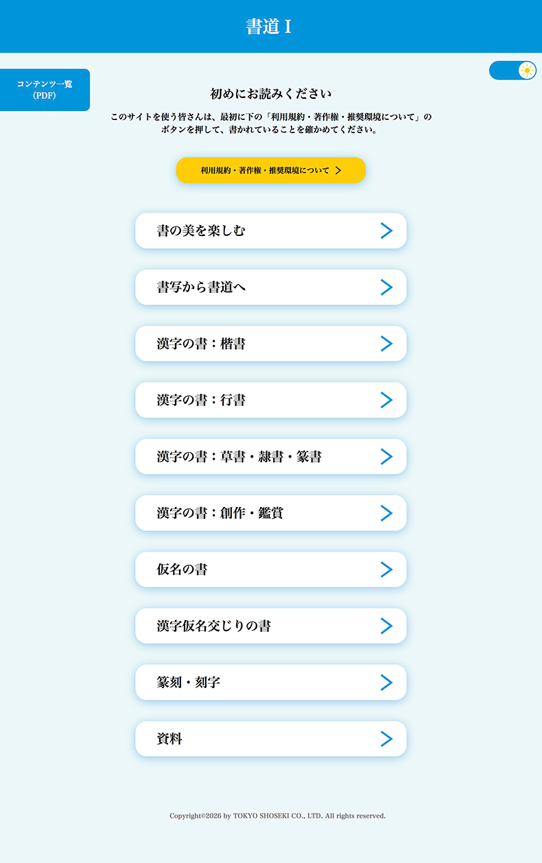 「書道Ⅰ」「書道Ⅱ」「書道Ⅲ」では、教科書の目次ページからコンテンツ一覧をご覧いただけます。