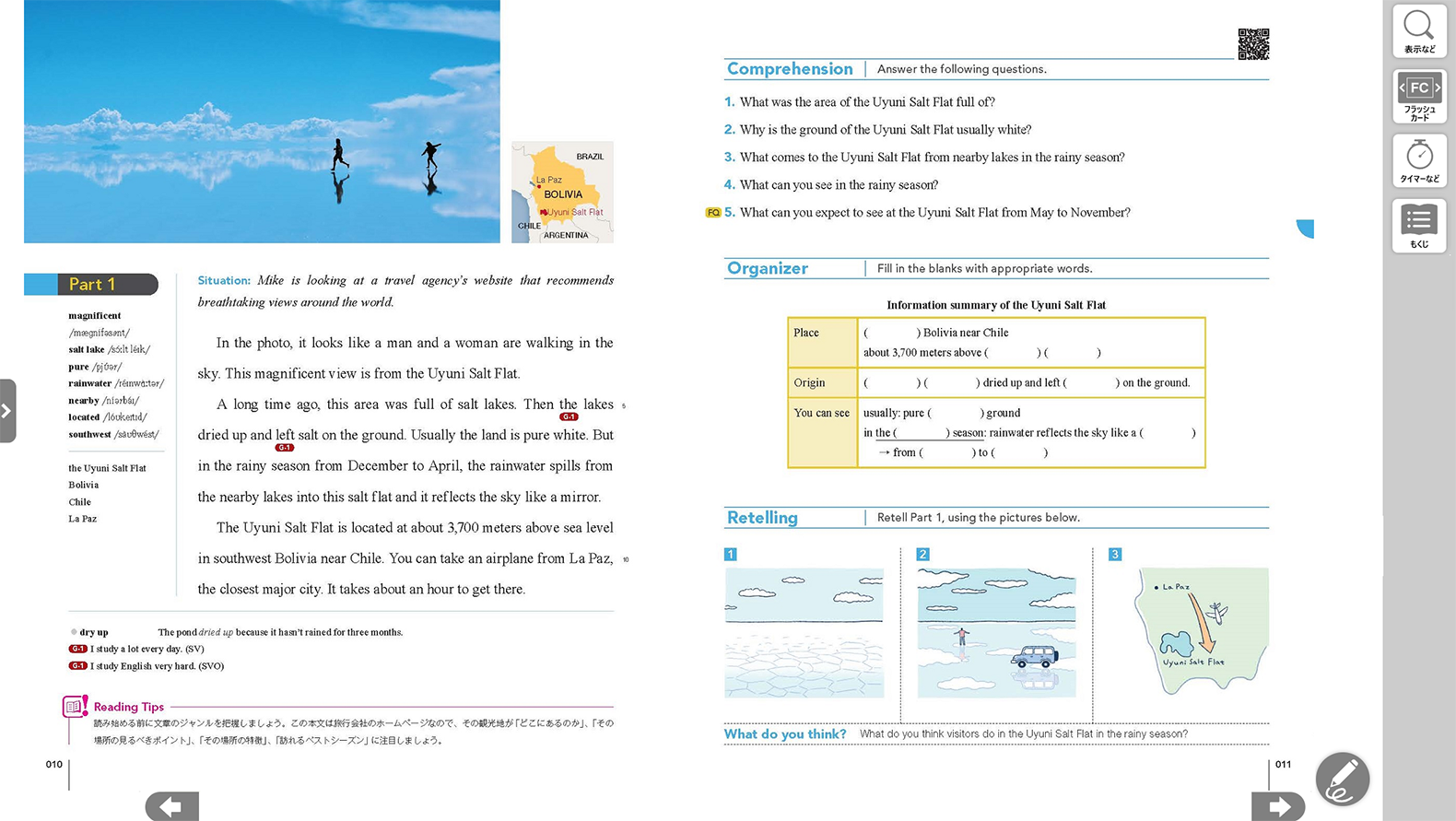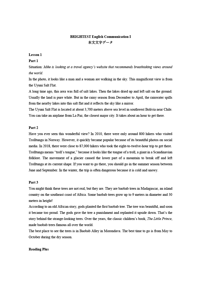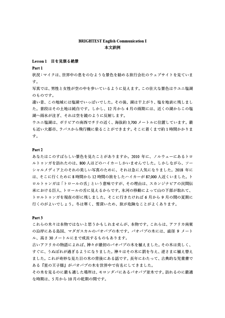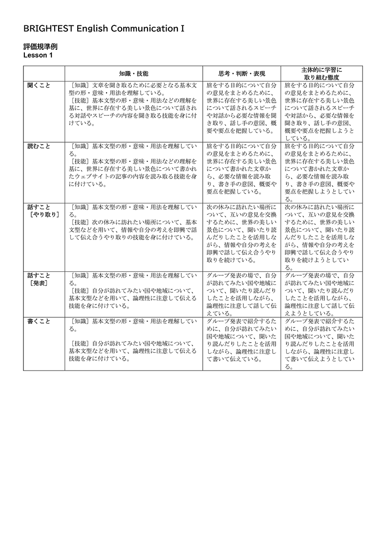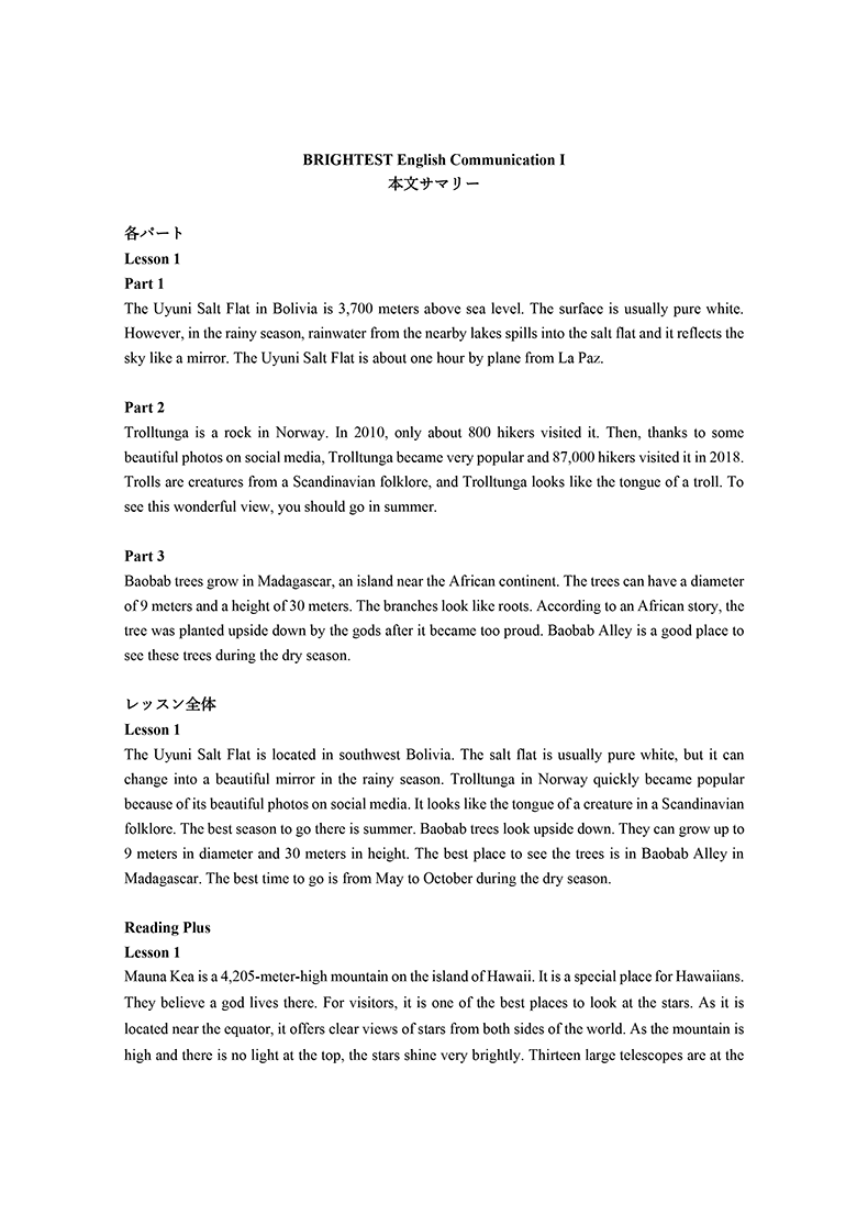 BRIGHTESTでは、社会的なテーマや科学の題材を、わかりやすく取り上げています。中学までの英語力を土台に、リーディング・リスニング力をさらにレベルアップし、豊富なリテリング活動を通じて表現力を身に付け、自分の考えをアウトプットする力を養うことができます。生徒が活動に取り組む際に役立つTipsも随所に盛り込みました。