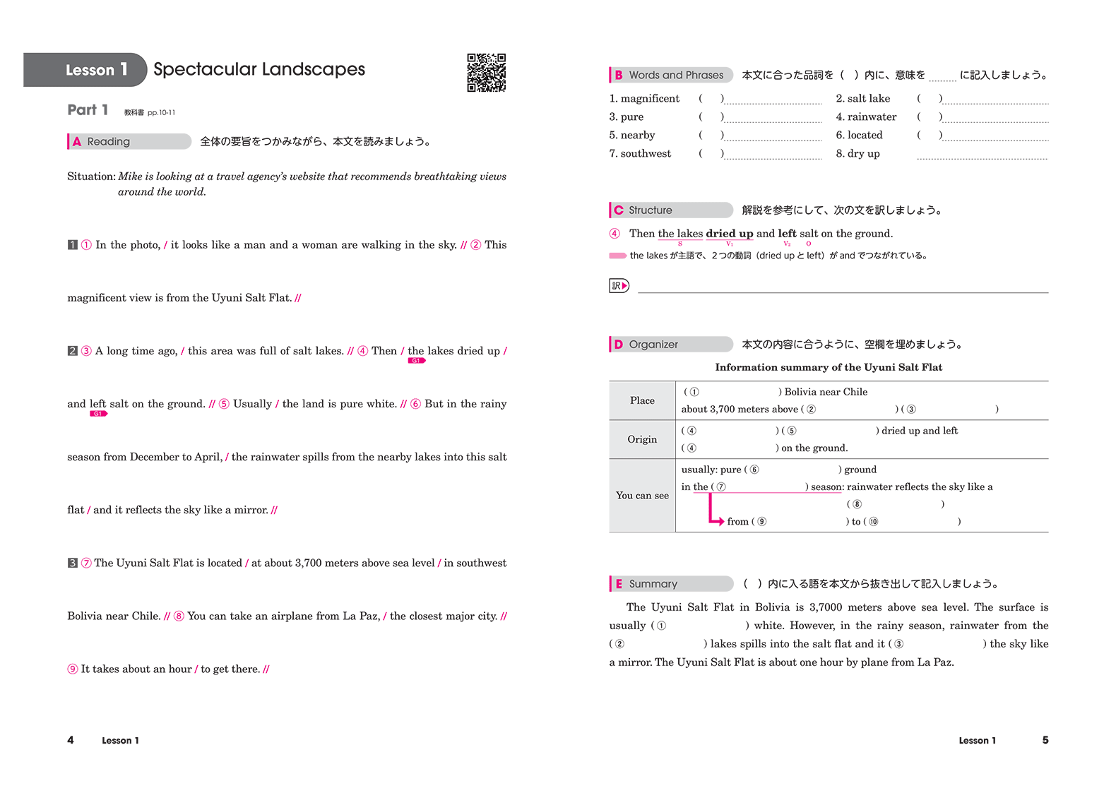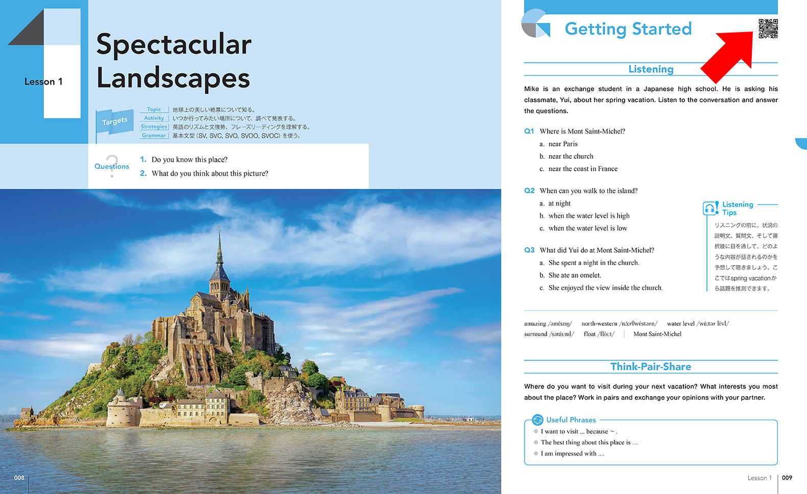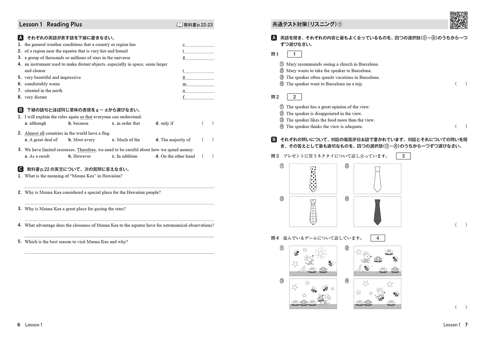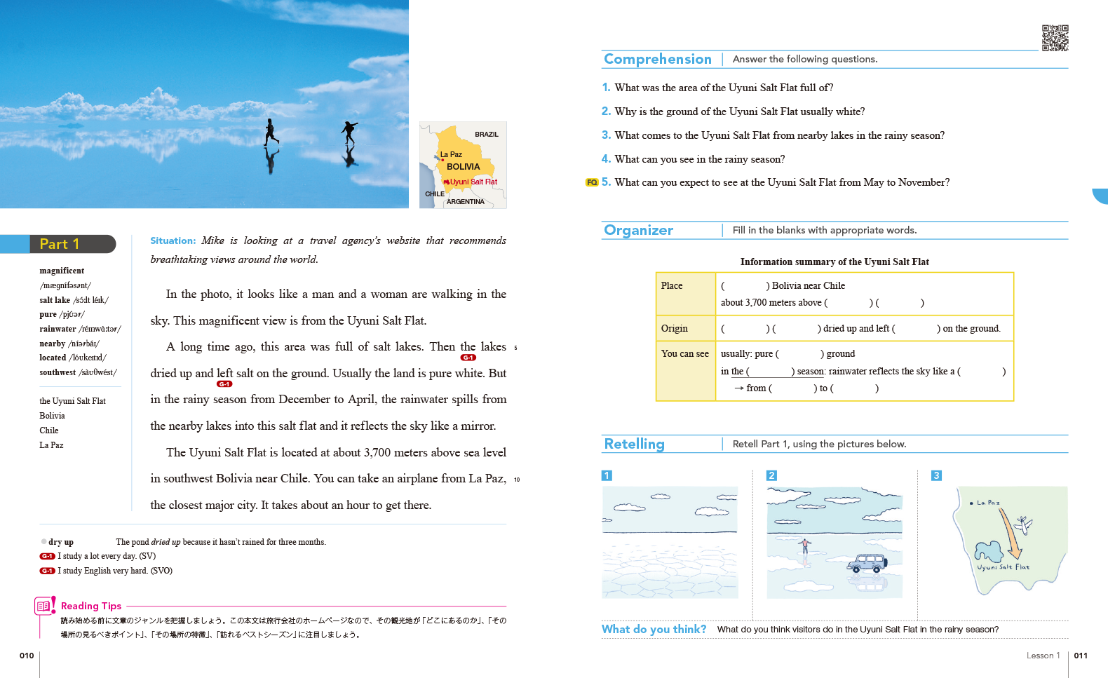 BRIGHTESTでは、社会的なテーマや科学の題材を、わかりやすく取り上げています。中学までの英語力を土台に、リーディング・リスニング力をさらにレベルアップし、豊富なリテリング活動を通じて表現力を身に付け、自分の考えをアウトプットする力を養うことができます。生徒が活動に取り組む際に役立つTipsも随所に盛り込みました。