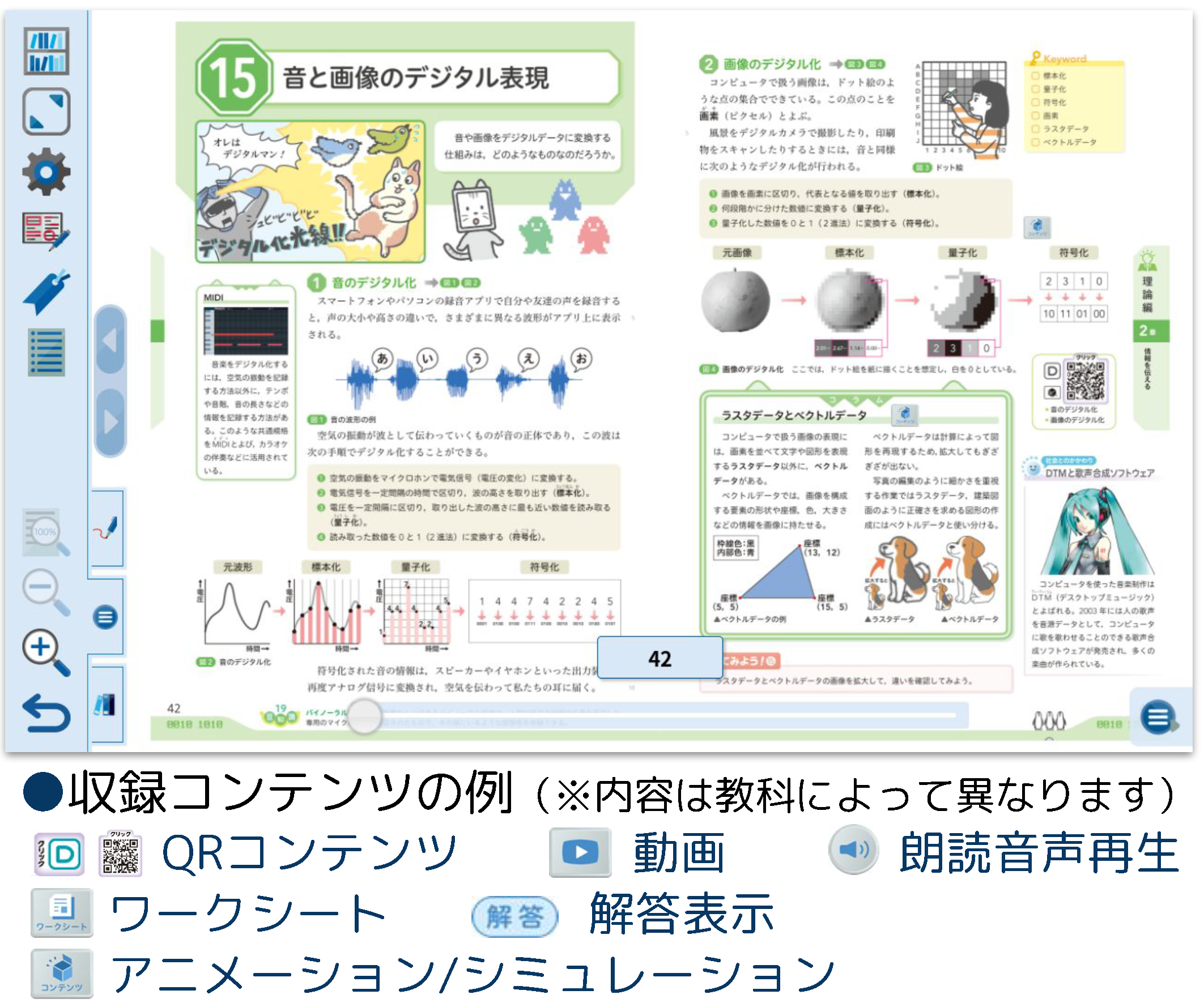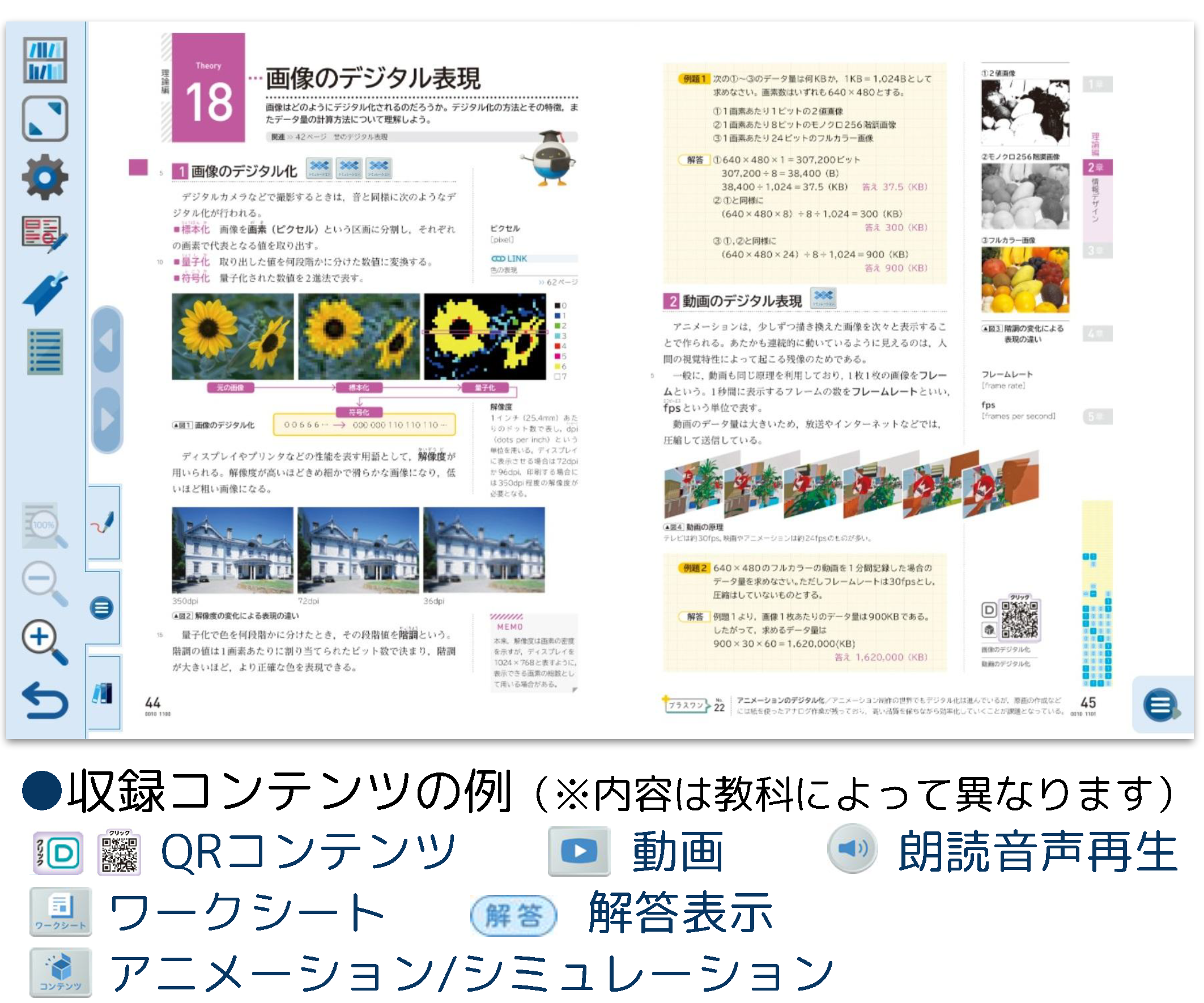 教師用指導資料には「指導者用デジタルブック」が付属します。電子黒板やプロジェクタなどを使用して,教科書紙面や関連するコンテンツを提示することができる指導用教材です。多様なコンテンツを収録しており,教科書紙面上のアイコンをクリックするだけでご利用いただけます。