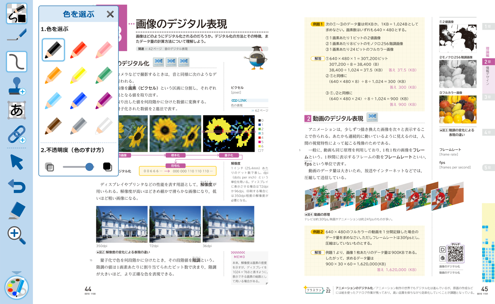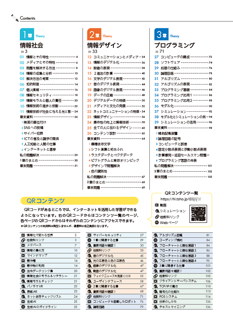 東京書籍の教科書では、学びを深めるための動画やシミュレーション、Webページ、他教科の教科書紙面など、教科特性に合わせてさまざまなQRコンテンツをご用意しています。