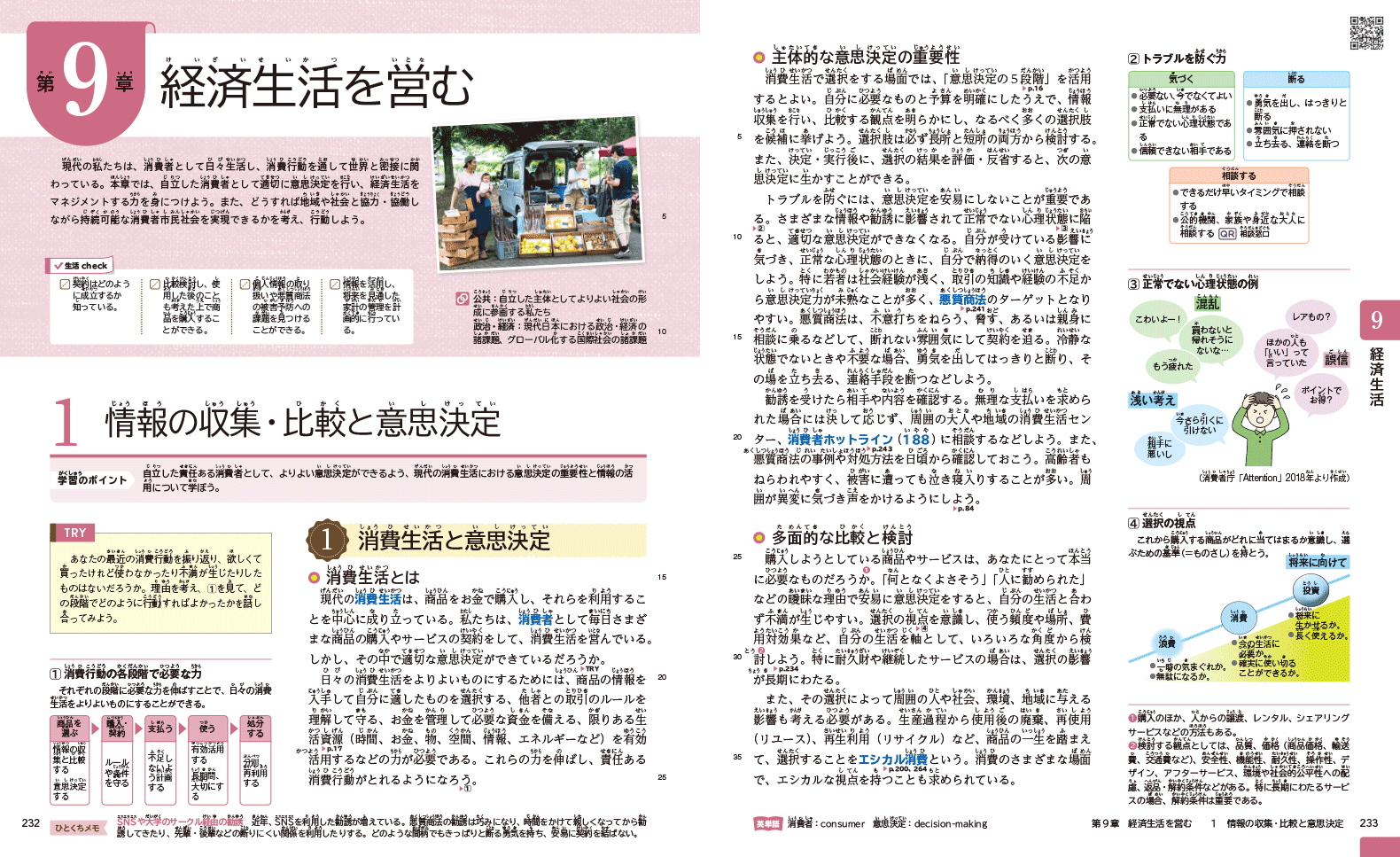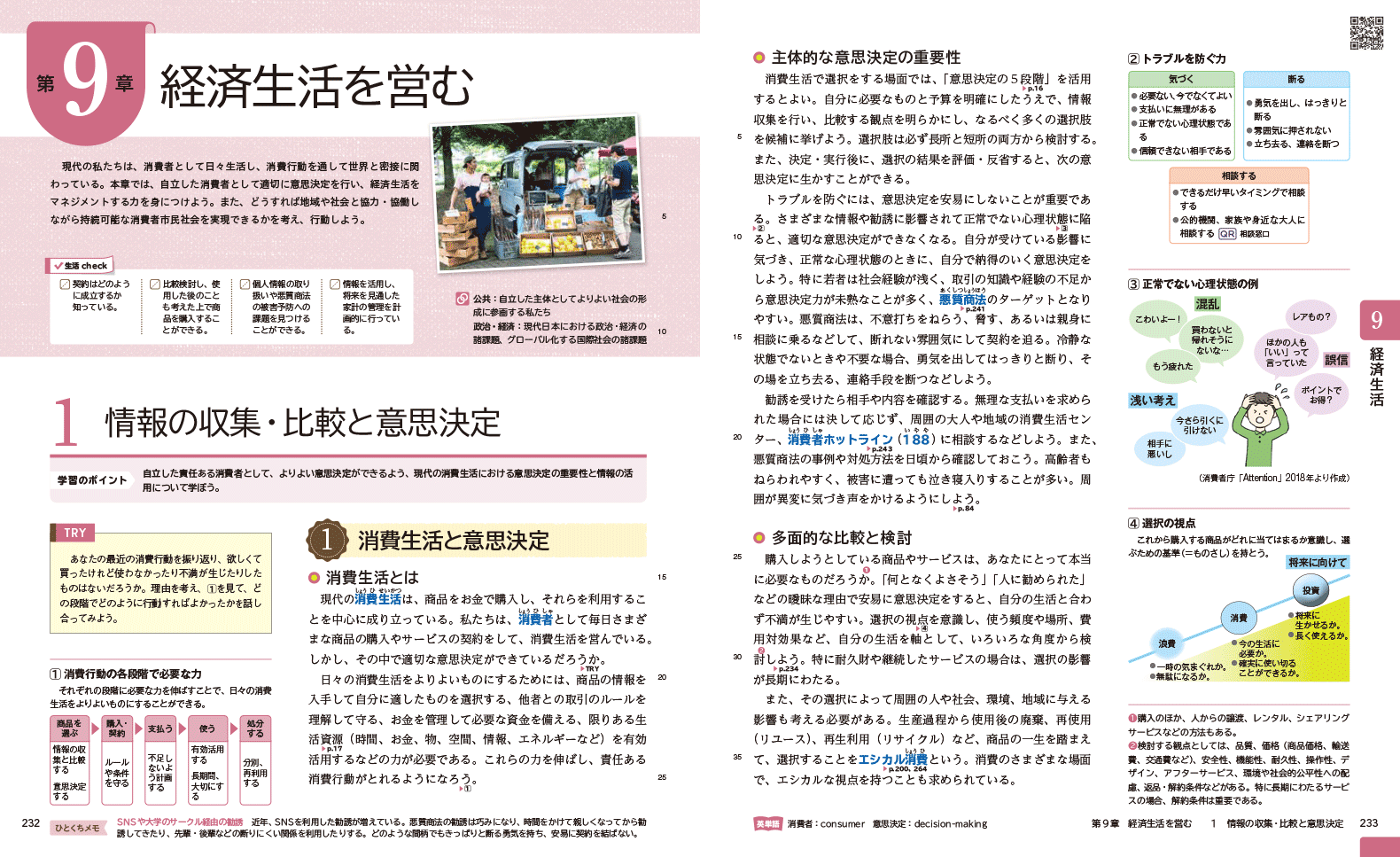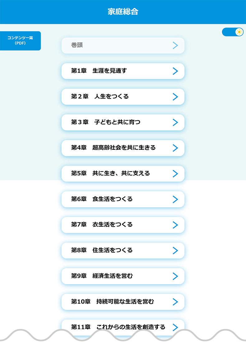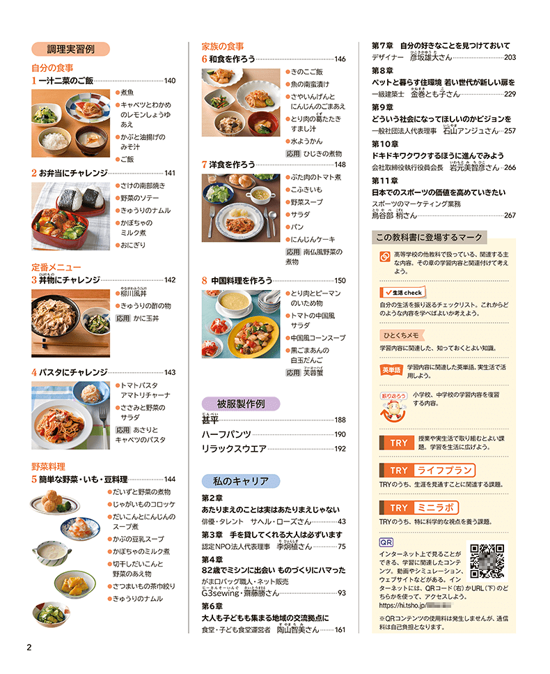 QRコンテンツがあるページでは、見開きの右上にQRコードを掲載しています。また、「家庭総合」p.2にある二次元コードから、コンテンツのもくじへアクセスできます。