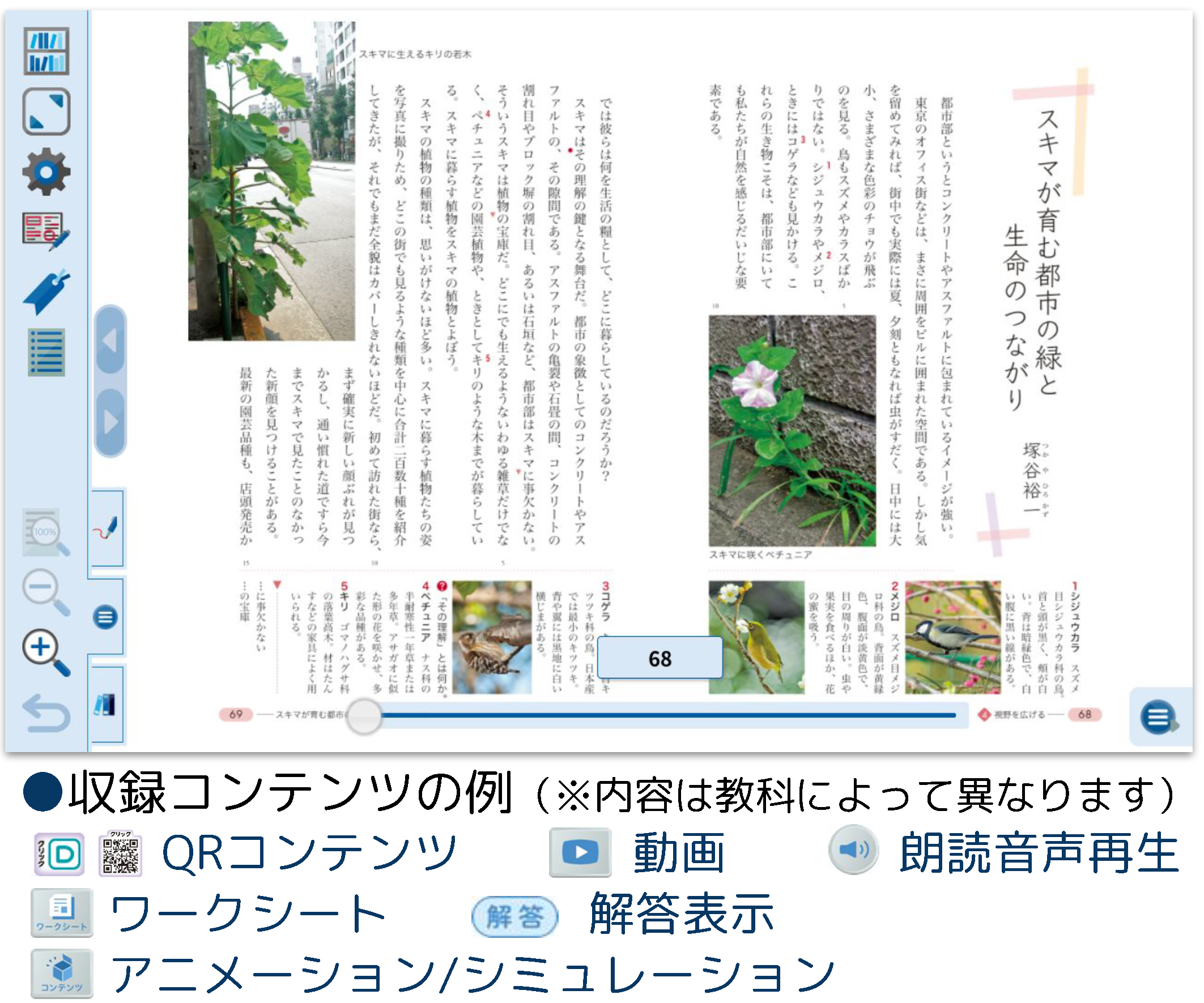 教師用指導資料には「指導者用デジタルブック」が付属します。電子黒板やプロジェクタなどを使用して,教科書紙面や関連するコンテンツを提示することができる指導用教材です。多様なコンテンツを収録しており,教科書紙面上のアイコンをクリックするだけでご利用いただけます。