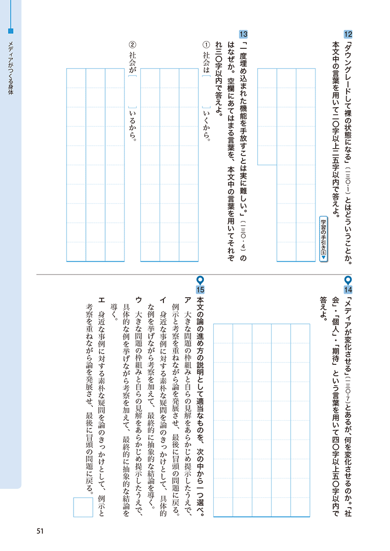 - 評論用語の基礎固めとなる「評論文キーワード」や、入試問題をもとにした「実戦編」など、入試を見据えた練習問題を豊富に掲載。