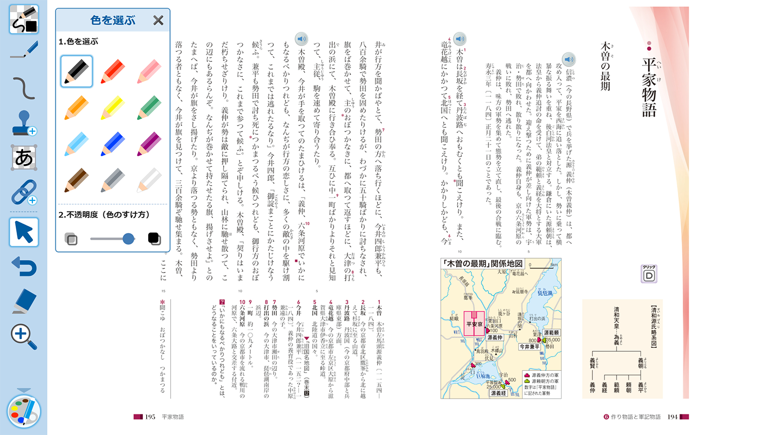電子黒板やプロジェクタなどを使用して、教科書紙面や関連するコンテンツを提示することができる指導用教材です。多様なコンテンツを収録しており、教科書紙面上のアイコンをクリックするだけでご利用いただけます。
