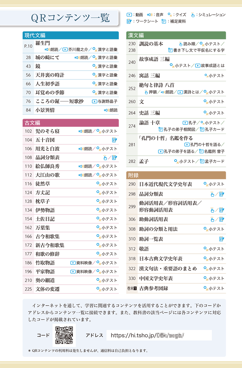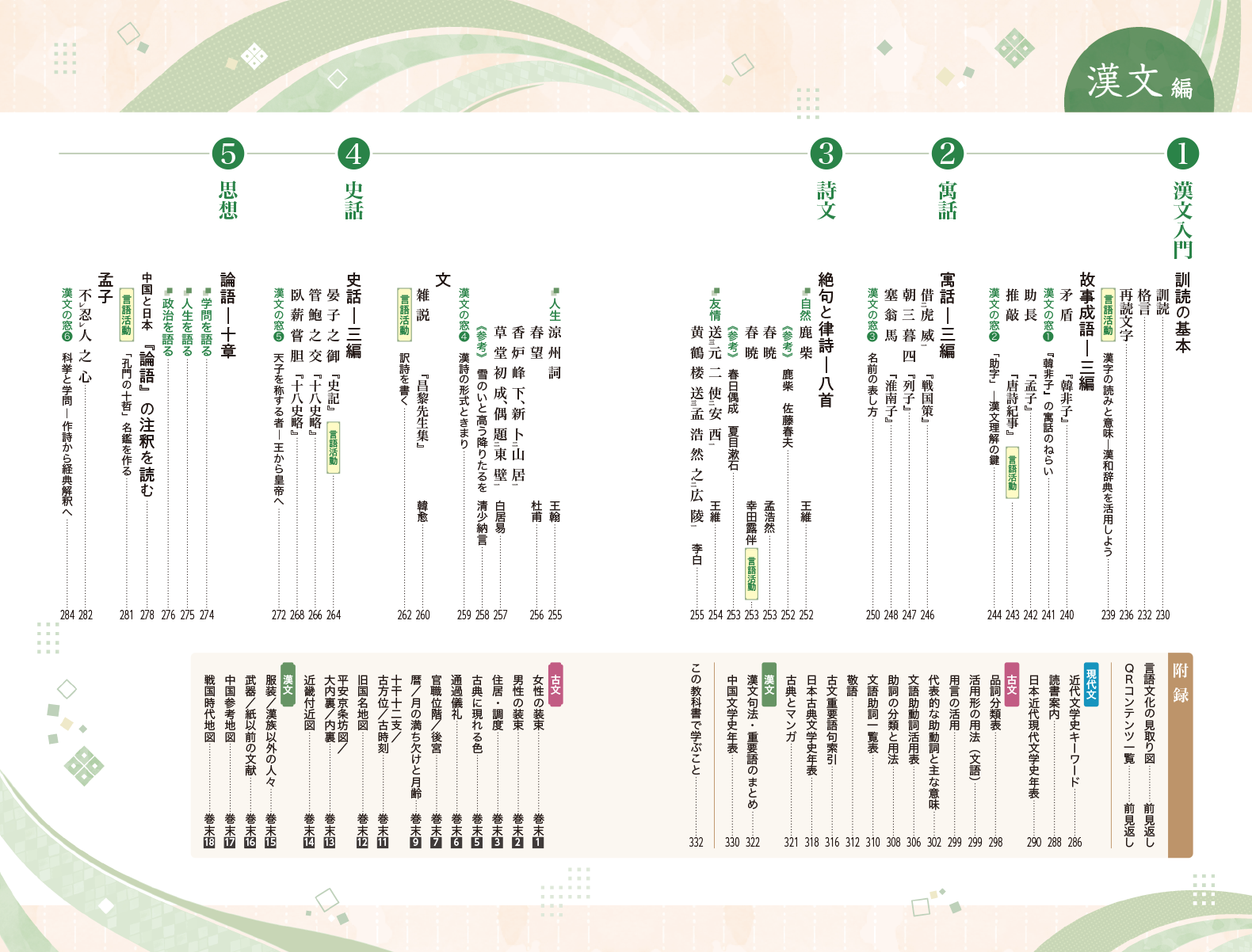 - (漢文編)教材の人間関係を問うページを設けました。また、漢詩のページに示す二次元コードからインターネットに接続することで、各詩の朗読音声(書き下し文・中国語)を聴くことができます。(通信料は自己負担となります。)