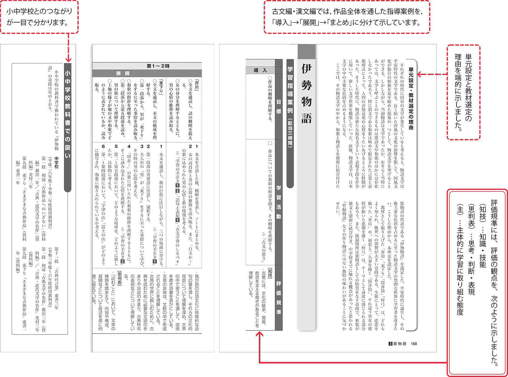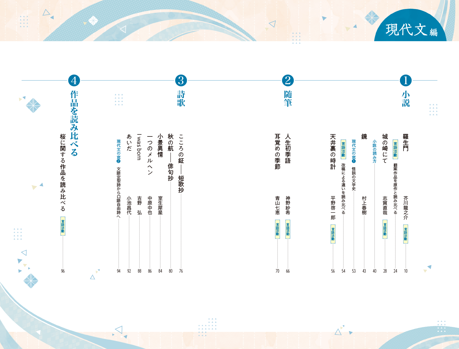 ・現代文では古典的な定評教材や教科書採録教材と同じテーマ・筆者の作品など、古文・漢文では教科書採録作品の別の章段など、授業で発展的に使える資料を収録しています。