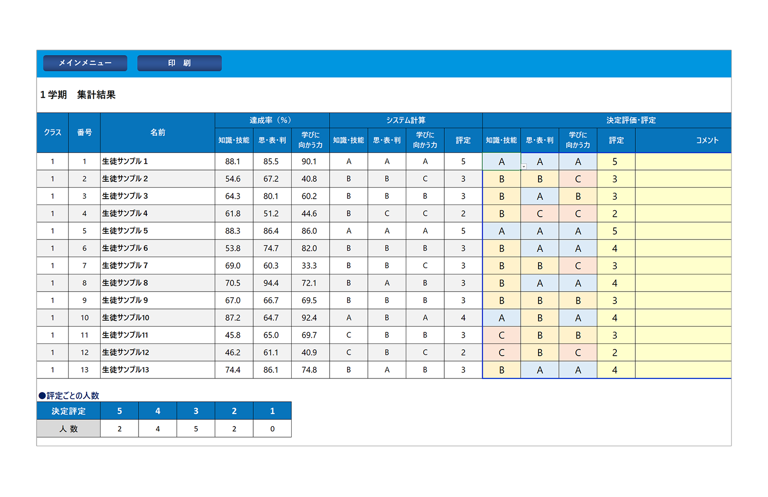 - ・評価問題、学習課題ノート、現代文小テスト、ルーブリックなどの評価を観点別に集計できるツールです。実態に合わせてカスタマイズもできます。