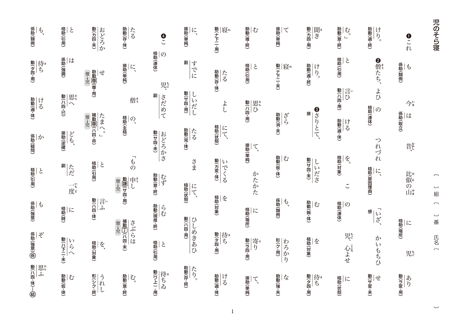 ・古文の教材本文を、品詞分解を書き込めるスタイルに加工したワークシート。