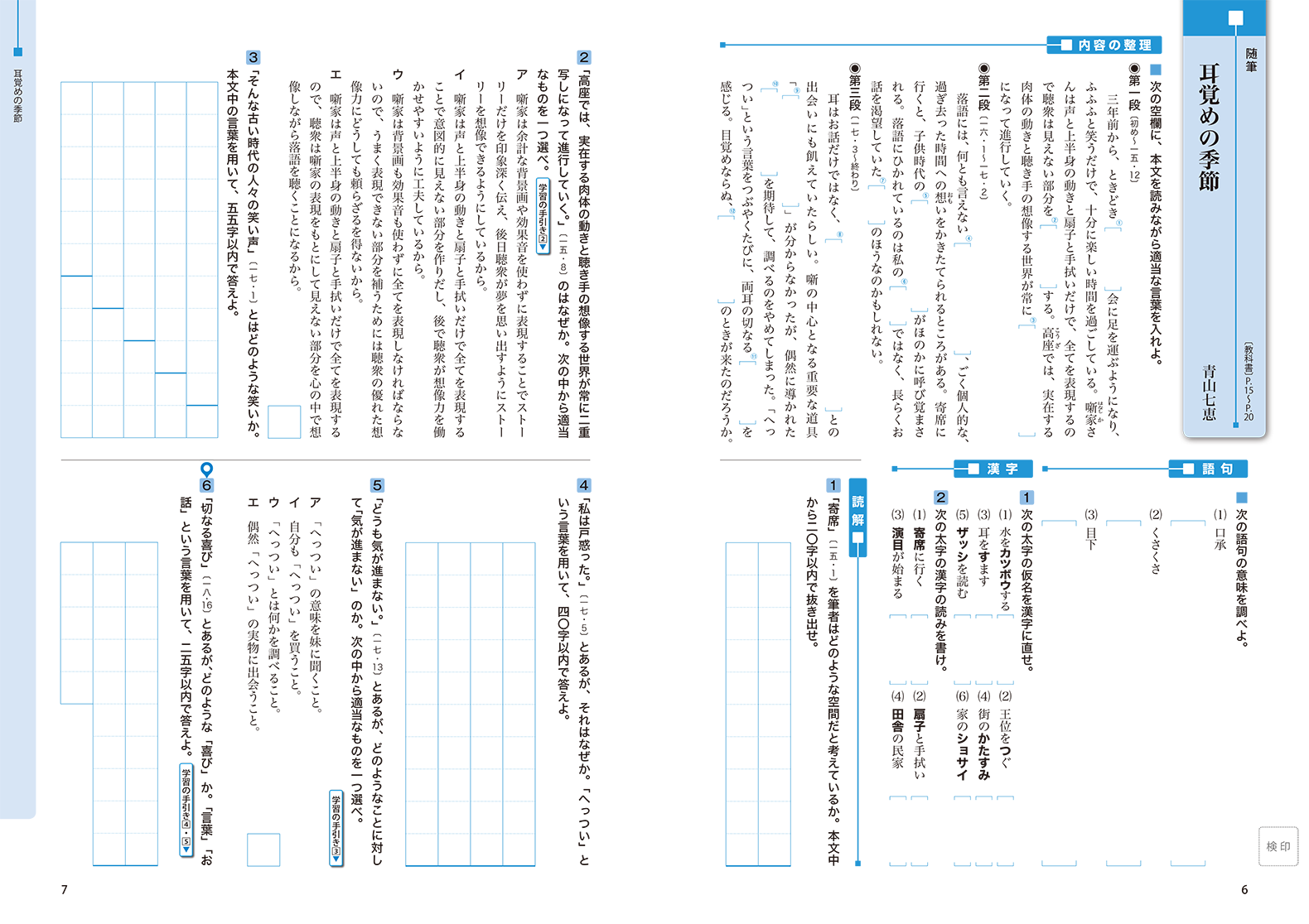 - (現代文編)記述式問題は、さまざまなパターンの問題形式を設け、生徒が自然に記述力を高めていけるようにしました。