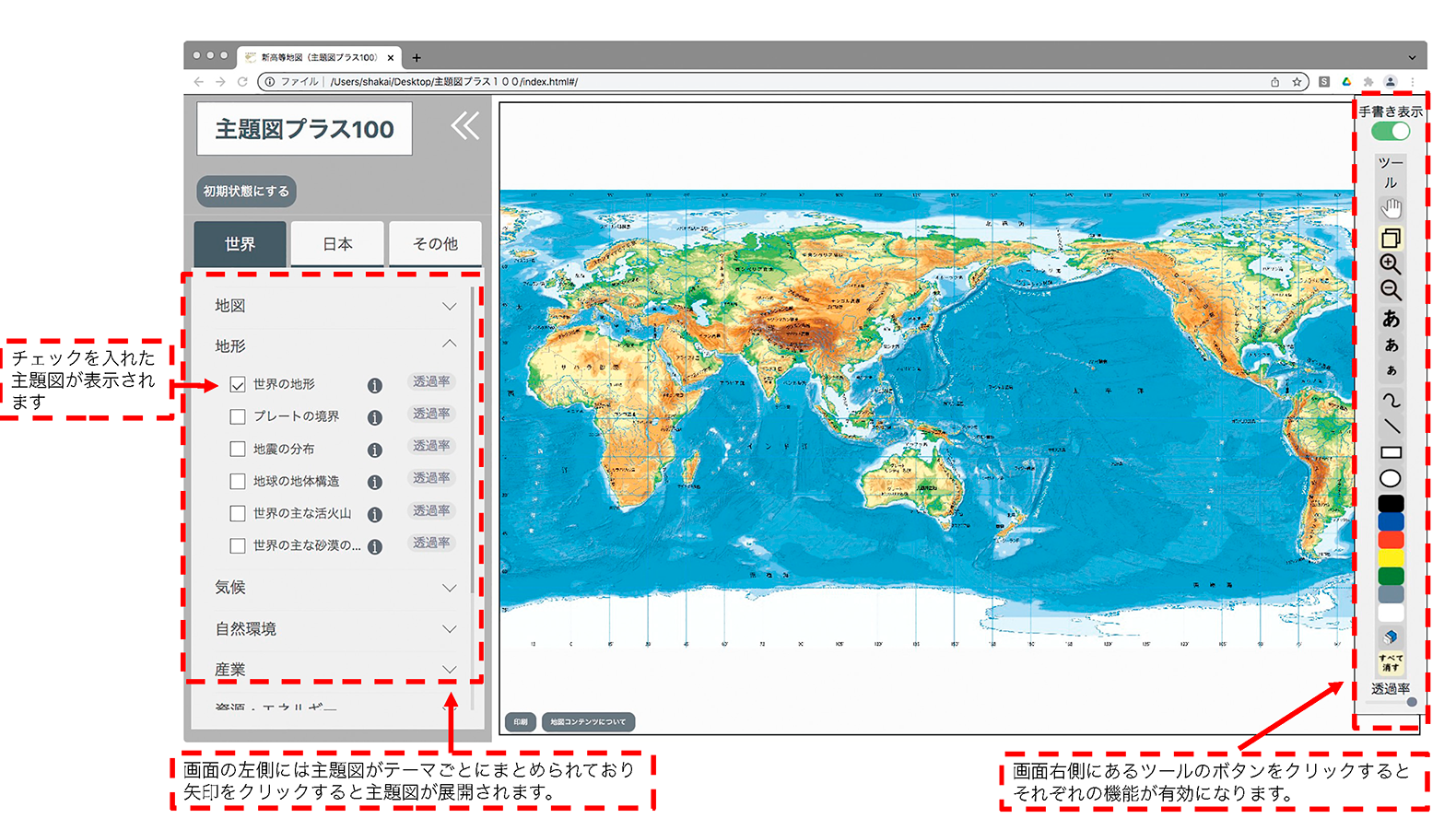 『新高等地図』では,教科書目次ページからコンテンツ一覧をご覧いただけます。