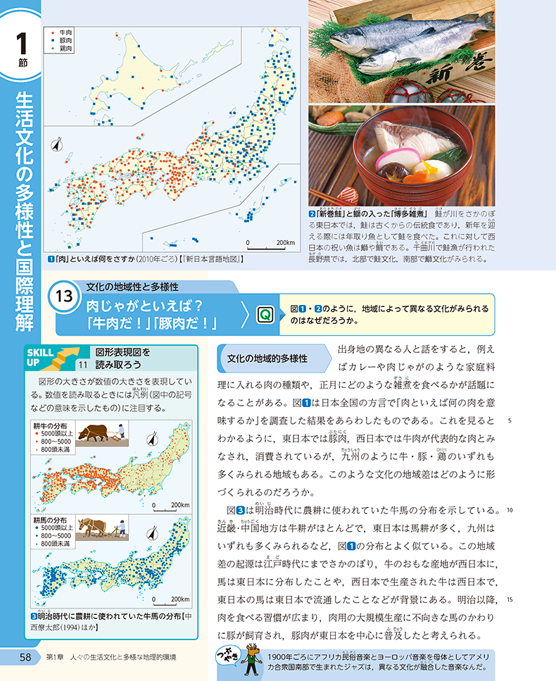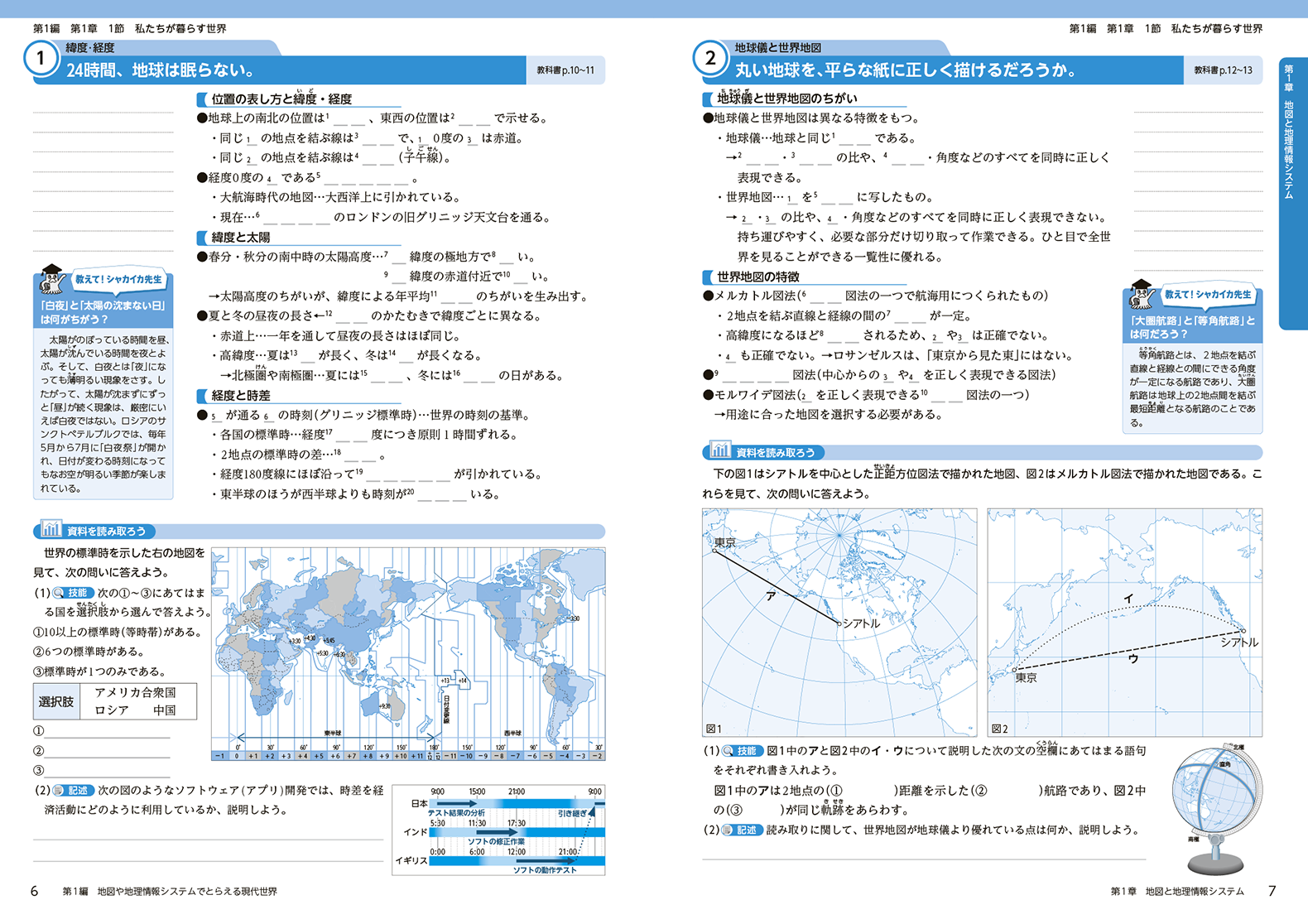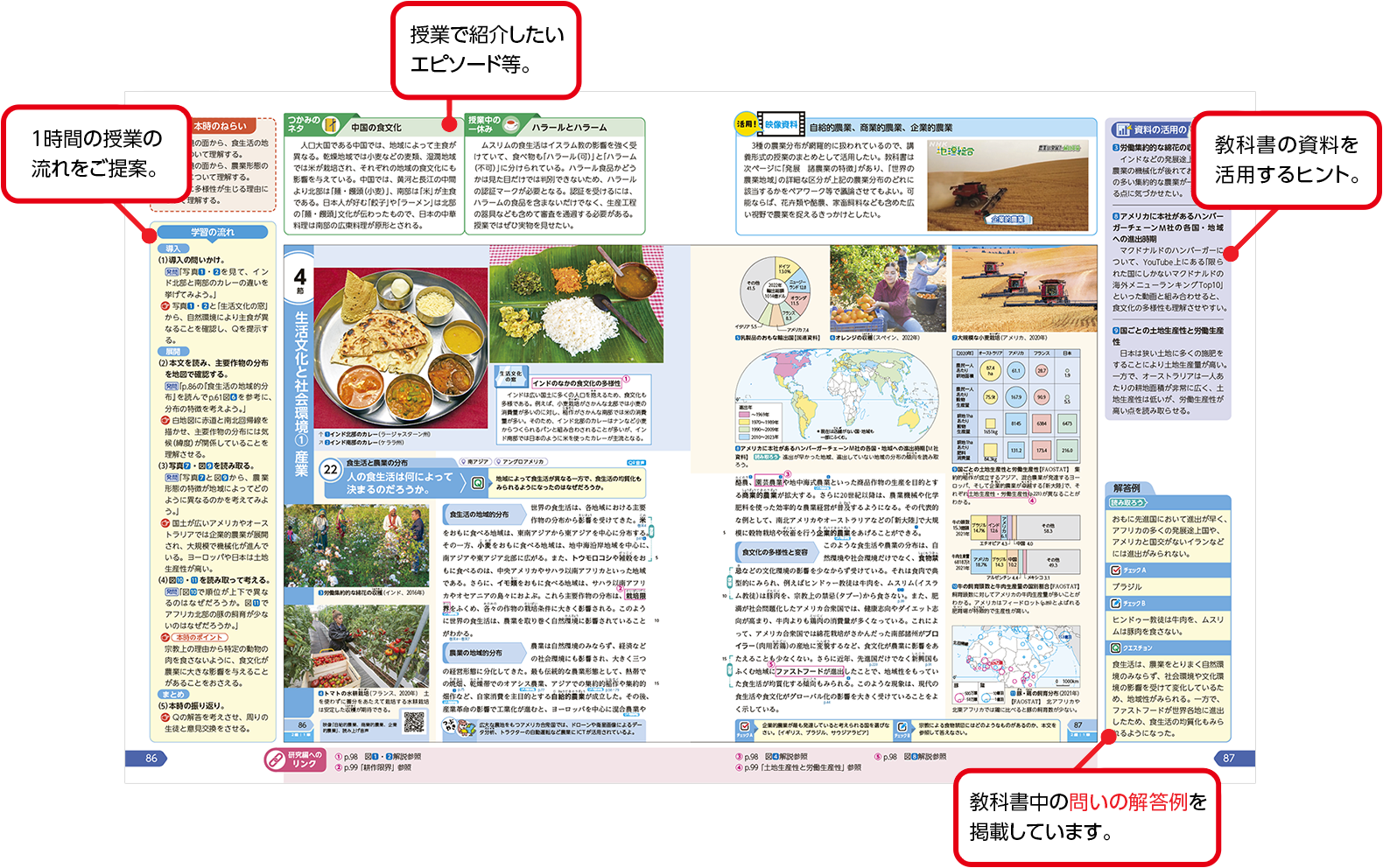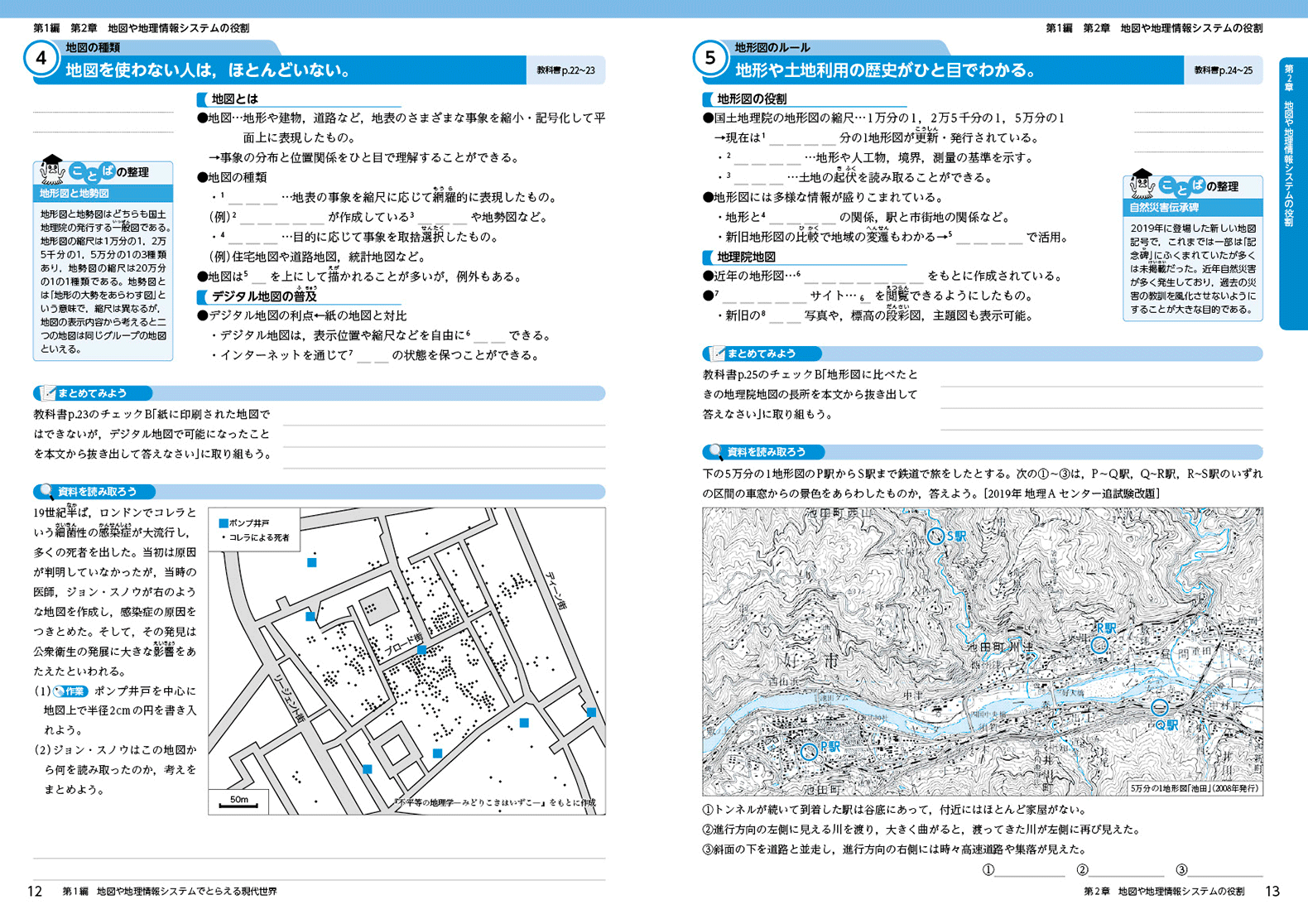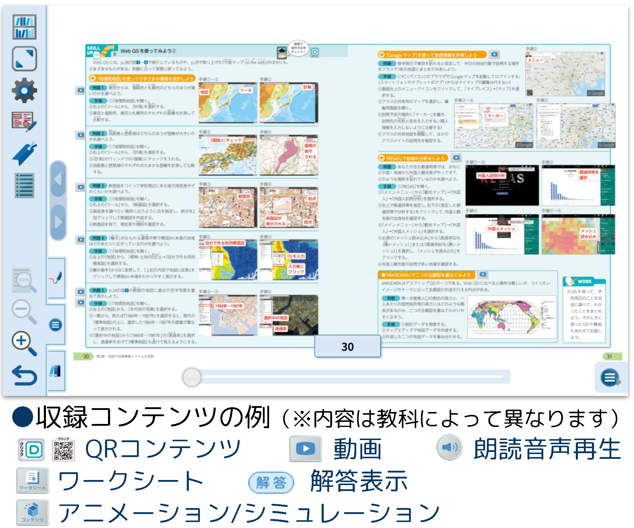 『地理総合』では、教科書目次ページからコンテンツ一覧へのリンクのほか、該当箇所からも直接関連するコンテンツをご覧いただけます。