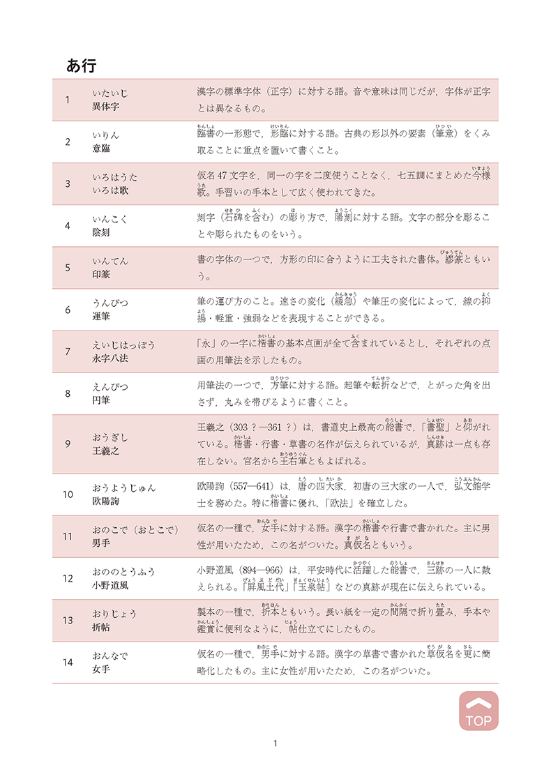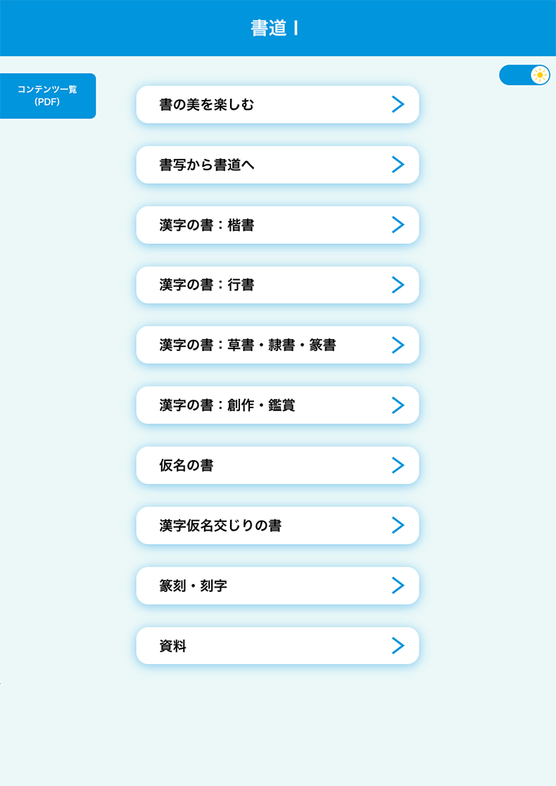 「書道Ⅰ」「書道Ⅱ」「書道Ⅲ」では、教科書の目次ページからコンテンツ一覧をご覧いただけます。